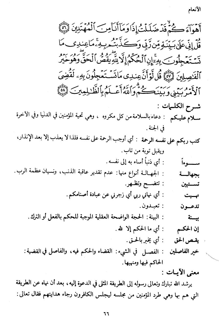 أَهْوَاءكُمْ قَدْ ضَلَلْتُ إِذًا وَمَا أَنَاْ مِنَ الْمُهْتَدِينَ (56) قُلْ إِنِّي عَلَى بَيِّنَةٍ مِّن رَّبِّي وَكَذَّبْتُم بِهِ مَا عِندِي مَا تَسْتَعْجِلُونَ بِهِ إِنِ الْحُكْمُ إِلاَّ لِلّهِ يَقُصُّ الْحَقَّ وَهُوَ خَيْرُ الْفَاصِلِينَ (58) قُل لَّوْ أَنَّ عِندِي مَا تَسْتَعْجِلُونَ بِهِ لَقُضِيَ الأَمْرُ بَيْنِي وَبَيْنَكُمْ وَاللهُ أَعْلَمُ بِالظَّالِمِينَ (58)