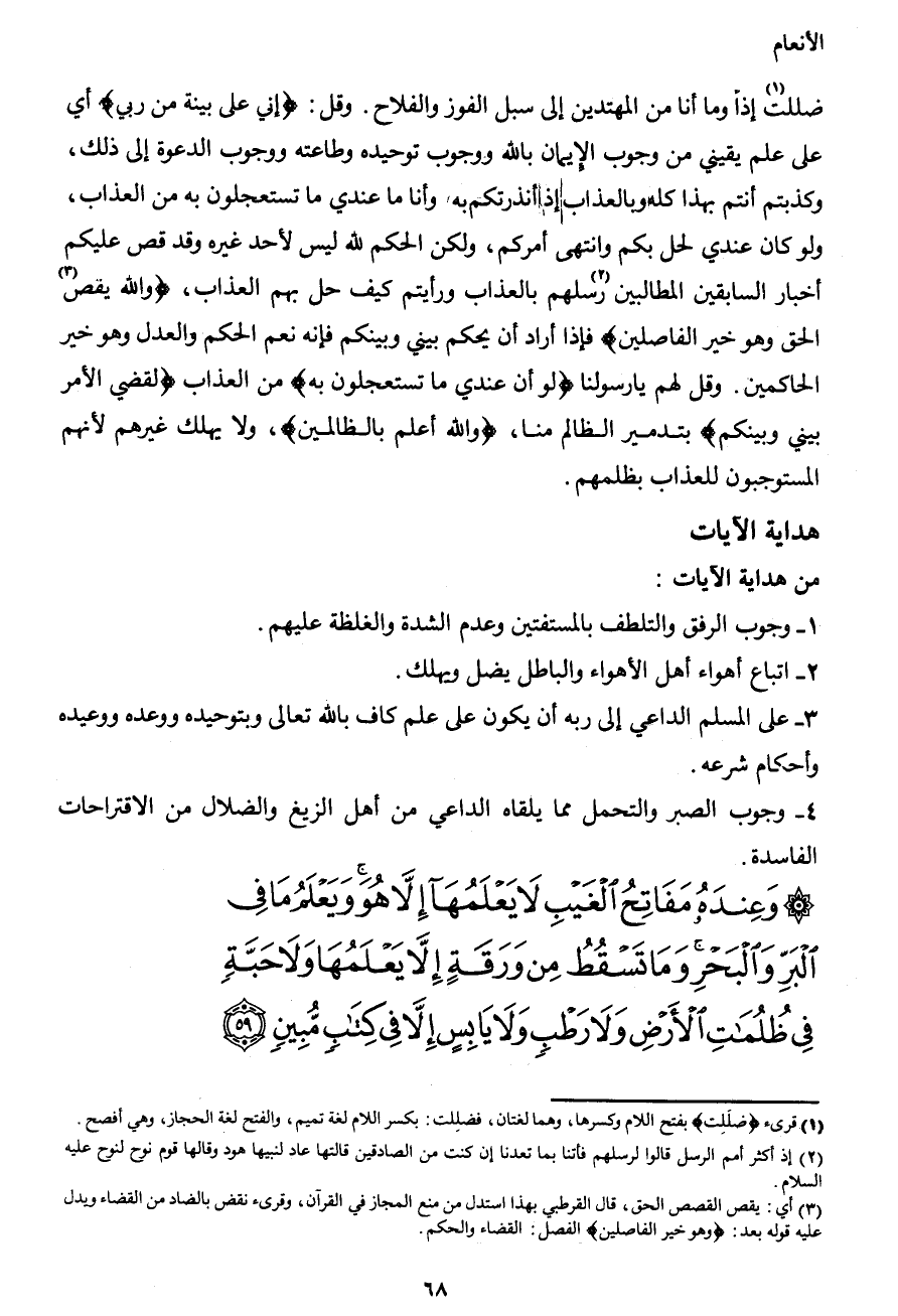 ضللت1 إذاً وما أنا من المهتدين إلى سبل الفوز والفلاح. وقل: {إني على بينة من ربي} أي على علم يقيني من وجوب الإيمان بالله ووجوب توحيده وطاعته ووجوب الدعوة إلى ذلك، وكذبتم أنتم بهذا كله وبالعذاب إذ أنذرتكم به وأنا ما عندي ما تستعجلون به من العذاب، ولو كان عندي لحل بكم وانتهى أمركم، ولكن الحكم لله ليس لأحد غيره وقد قص عليكم أخبار السابقين المطالبين2 رسلهم بالعذاب ورأيتم كيف حل بهم العذاب، {والله يقص3 الحق وهو خير الفاصلين} فإذا أراد أن يحكم بيني وبينكم فإنه نعم الحكم والعدل وهو خير الحاكمين. وقل لهم يا رسولنا {لو أن عندي ما تستعجلون به} من العذاب {لقضي الأمر بيني وبينكم} بتدمير الظالم منا، {والله أعلم بالظالمين} ، ولا يهلك غيرهم لأنهم المستوجبون للعذاب بظلمهم.