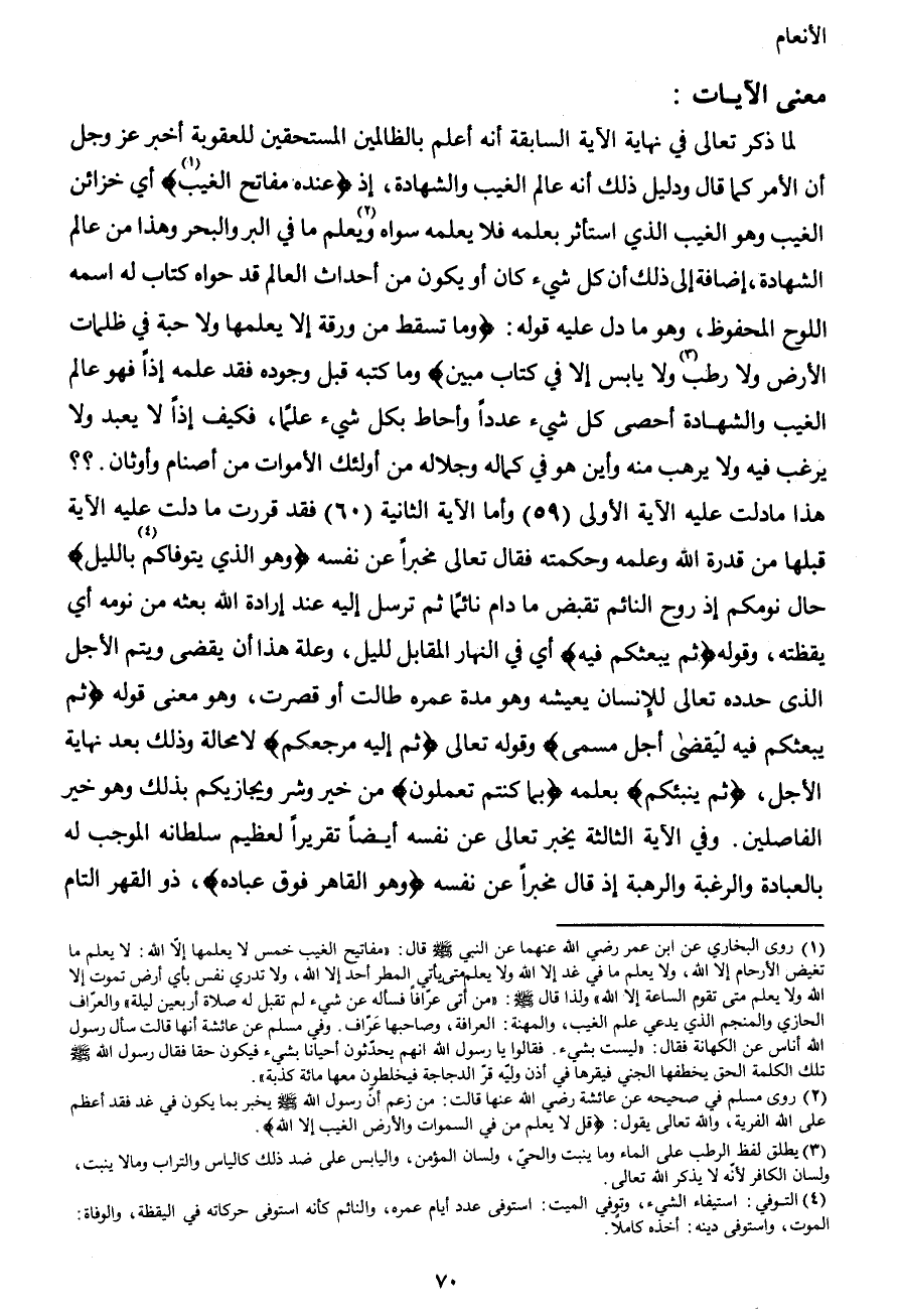 لما ذكر تعالى في نهاية الآية السابقة أنه أعلم بالظالمين المستحقين للعقوبة أخبر عز وجل أن الأمر كما قال ودليل ذلك أنه عالم الغيب والشهادة، إذ {عنده مفاتح الغيب1} أي خزائن الغيب وهو الغيب الذي استأثر بعلمه فلا يعلمه سواه2 ويعلم ما في البر والبحر وهذا من عالم الشهادة، إضافة إلى ذلك أن كل شيء كان أو يكون من أحداث العالم قد حواه كتاب له اسمه اللوح المحفوظ، وهو ما دل عليه قوله: {وما تسقط من ورقة إلا يعلمها ولا حبة في ظلمات الأرض ولا رطب3 ولا يابس إلا في كتاب مبين} وما كتبه قبل وجوده فقد علمه إذاً فهو عالم الغيب والشهادة إضافة إلى ذلك أن كل شيء كان أو يكون من أحداث العالم قد حواه كتاب له اسمه اللوح المحفوظ، وهو ما دل عليه قوله: {وما تسقط من ورقة إلا يعلمها ولا حبة في ظلمات الأرض ولا رطب ولا يابس إلا في كتاب مبين} وما كتبه قبل وجوده فقد علمه إذاً فهو عالم الغيب والشهادة أحصى كل شيء عدداً وأحاط بكل شيء علماً، فكيف إذاً لا يعبد ولا يرغب فيه ولا يرهب منه وأين هو في كماله وجلاله من أولئك الأموات من أصنام وأوثان.؟؟ هذا ما دلت عليه الآية الأولى (59) وأما الآية الثانية (65) فقد قررت ما دلت عليه الآية قبلها من قدرة الله وعلمه وحكمته فقال تعالى مخبراً عن نفسه {وهو الذي يتوفاكم4 بالليل} حال نومكم إذ روح النائم تقبض ما دام نائماً ثم ترسل إليه عند إرادة الله بعثه من نومه أي يقظته، وقوله {ثم يبعثكم فيه} أي في النهار المقابل لليل، وعلة هذا أن يقضى ويتم الأجل الذي حدده تعالى للإنسان يعيشه وهو مدة عمره طالت أو قصرت، وهو معنى قوله {ثم يبعثكم فيه ليُقضى أجل مسمى} وقوله تعالى {ثم إليه مرجعكم} لا محالة وذلك بعد نهاية الأجل، {ثم ينبئكم} بعلمه {بما كنتم تعملون} من خير وشر ويجازيكم بذلك وهو خير الفاصلين. وفي الآية الثالثة يخبر تعالى عن نفسه أيضاً تقريراً لعظيم سلطانه الموجب له بالعبادة والرغبة والرهبة إذ قال مخبراً عن نفسه {وهو القاهر فوق عباده} ، ذو القهر التام