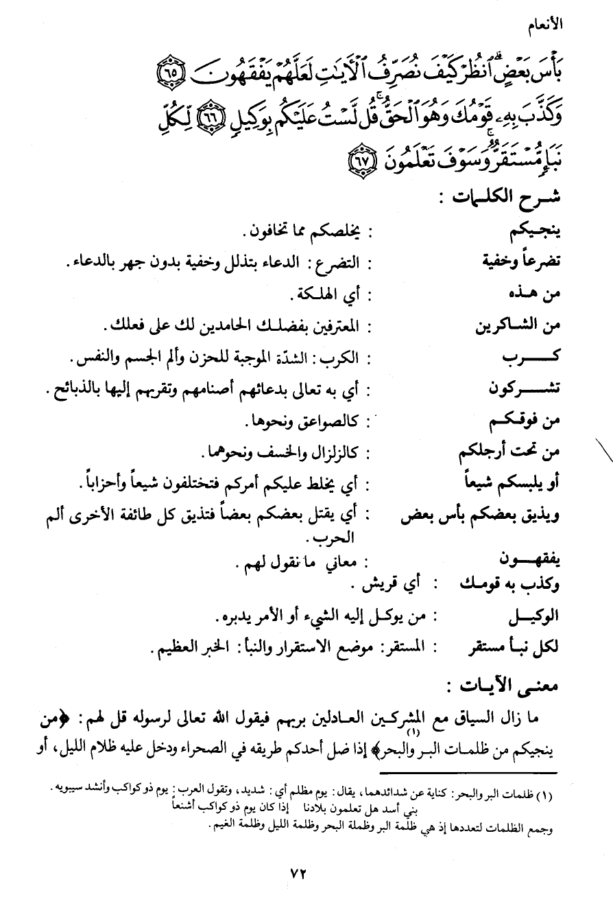1 ظلمات البر والبحر: كناية عن شدائدهما، يقال: يوم مظلم أي: شديد، وتقول العرب: يوم ذو كواكب وأنشد سيبويه.