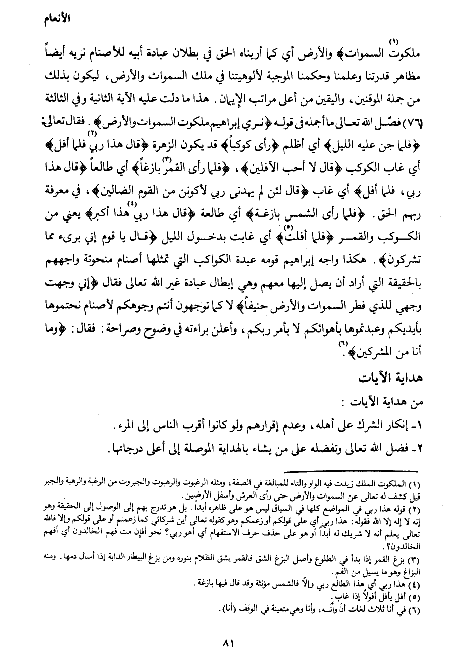 ملكوت1 السموات} والأرض أي كما أريناه الحق في بطلان عبادة أبيه للأصنام نريه أيضاً مظاهر قدرتنا وعلمنا وحكمنا الموجبة لألوهيتنا في ملك السموات والأرض، ليكون بذلك من جملة الموقنين، واليقين من أعلى مراتب الأيمان. هذا ما دلت عليه الآية الثانية وفي الثالثة (76) فصّل الله تعالى ما أجمله في قوله {نري إبراهيم ملكوت السموات والأرض} فقال تعالى: {فلما جن عليه الليل} أي أظلم {رأى كوكبا} قد يكون الزهرة {قال هذا ربي2 فلما أفل} أي غاب الكوكب {قال لا أحب الآفلين} ، {فلما رأى القمر3 بازغاً} أي طالعاً {قال هذا ربي، فلما أفل} أي غاب {قال لئن لم يهدني ربي لأكونن من القوم الضالين} ، في معرفة ربهم الحق. {فلما رأى الشمس بازغة} أي طالعة {قال هذا ربي4 هذا أكبر} يعني من الكوكب والقمر {فلما أفلت5} أي غابت بدخول الليل {قال يا قوم إني بريء مما تشركون} . هكذا واجه إبراهيم قومه عبدة الكواكب التي تمثلها أصنام منحوتة واجههم بالحقيقة التي أراد أن يصل إليها معهم وهي إبطال عبادة غير الله تعالى فقال {إني وجهت وجهي للذي فطر السموات والأرض حنيفاً} لا كما توجهون أنتم وجوهكم لأصنام نحتموها بأيديكم وعبدتموها بأهوائكم لا بأمر ربكم، وأعلن براءته في وضوح وصراحة: فقال: {وما أنا من المشركين} 6.