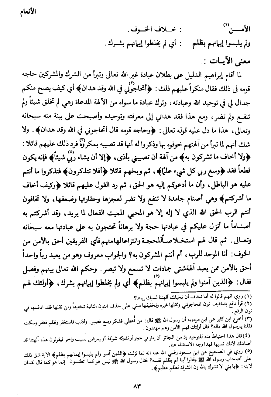 5 روي في الصحيح عن ابن مسعود رضي الله عنه أنه لما نزلت {الذين آمنوا ولم يلبسوا إيمانهم بظلم} الآية شق ذلك على أصحاب رسول الله صَلَّى اللهُ عَلَيْهِ وَسَلَّمَ وقالوا أينا لم يظلم نفسه؟ فقال رسول الله صَلَّى اللهُ عَلَيْهِ وَسَلَّمَ ليس هو كما تظنون إنما هو كما قال لقمان لابنه: {يا بني لا تشرك بالله إن الشرك لظلم عظيم} .