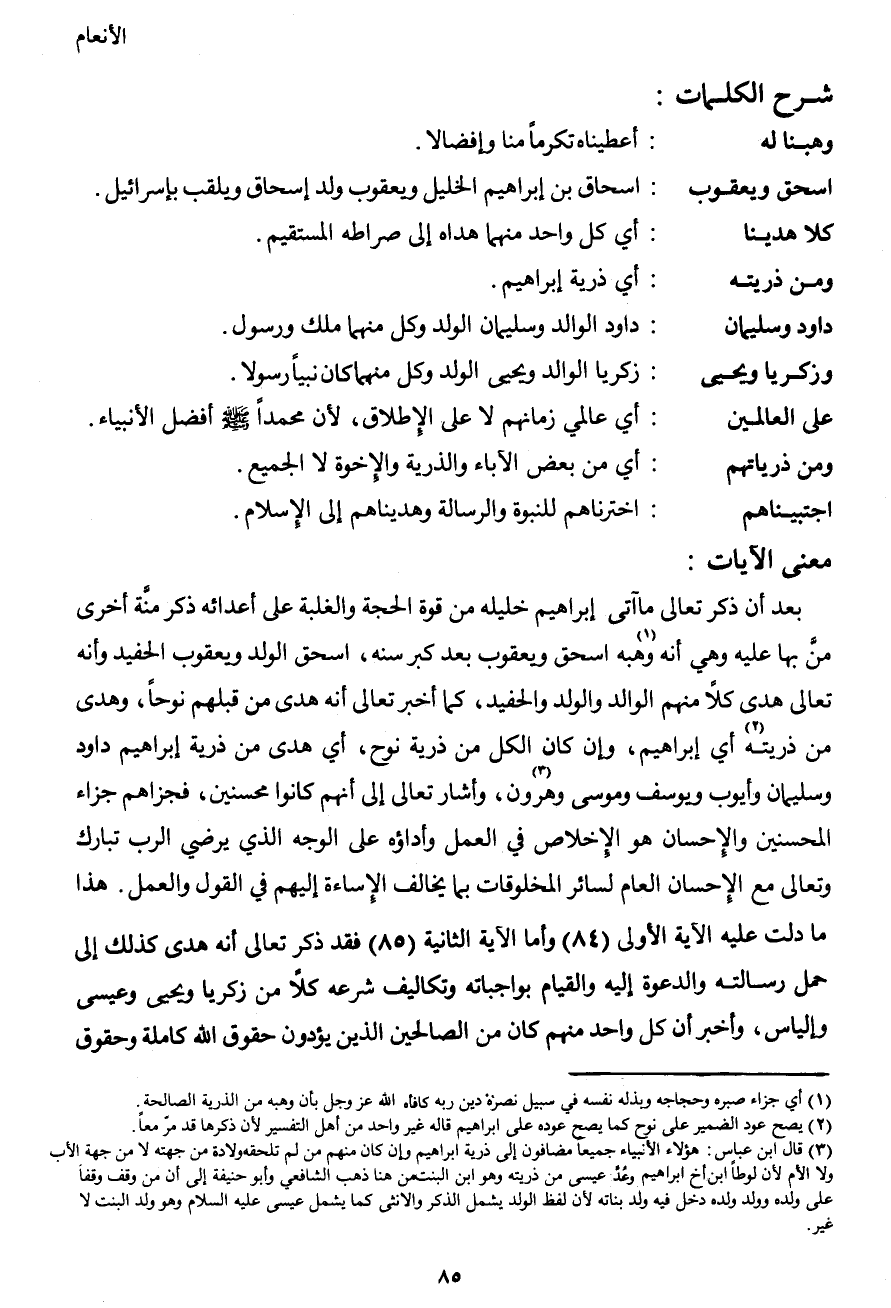 3 قال ابن عباس: هؤلاء الأنبياء جميعاً مضافون إلى ذرية إبراهيم وإن كان منهم من لم تلحقه ولادة من جهته لا من جهة الأب ولا الأم لأن لوطاً ابن أخ إبراهيم وعُدَّ عيسى من ذريته وهو ابن البنت من هنا ذهب الشافعي وأبو حنيفة إلى أن من وقف وقفاً على ولده وولد ولده دخل فيه ولد بناته لأن لفظ الولد يشمل الذكر والأنثى كما يشمل عيسى عليه السلام وهو ولد البنت لا غير.