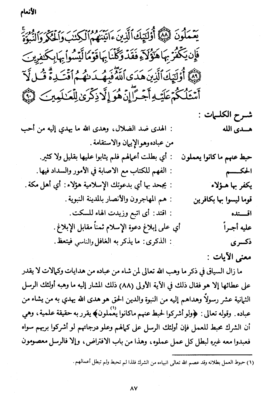 يَعْمَلُونَ (88) أُوْلَئِكَ الَّذِينَ آتَيْنَاهُمُ الْكِتَابَ وَالْحُكْمَ وَالنُّبُوَّةَ فَإِن يَكْفُرْ بِهَا هَؤُلاء فَقَدْ وَكَّلْنَا بِهَا قَوْمًا لَّيْسُواْ بِهَا بِكَافِرِينَ (89) أُوْلَئِكَ الَّذِينَ هَدَى اللهُ فَبِهُدَاهُمُ اقْتَدِهْ قُل لاَّ أَسْأَلُكُمْ عَلَيْهِ أَجْرًا إِنْ هُوَ إِلاَّ ذِكْرَى لِلْعَالَمِينَ (90)