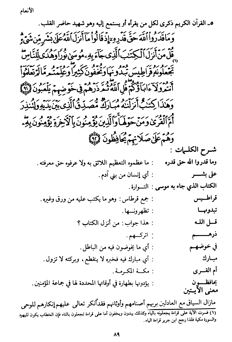 وَمَا قَدَرُواْ اللهَ حَقَّ قَدْرِهِ إِذْ قَالُواْ مَا أَنزَلَ اللهُ عَلَى بَشَرٍ مِّن شَيْءٍ قُلْ مَنْ أَنزَلَ الْكِتَابَ الَّذِي جَاء بِهِ مُوسَى نُورًا وَهُدًى لِّلنَّاسِ تَجْعَلُونَهُ1 قَرَاطِيسَ تُبْدُونَهَا وَتُخْفُونَ كَثِيرًا وَعُلِّمْتُم مَّا لَمْ تَعْلَمُواْ أَنتُمْ وَلاَ آبَاؤُكُمْ قُلِ اللهُ ثُمَّ ذَرْهُمْ فِي خَوْضِهِمْ يَلْعَبُونَ (91) وَهَذَا كِتَابٌ أَنزَلْنَاهُ مُبَارَكٌ مُّصَدِّقُ الَّذِي بَيْنَ يَدَيْهِ وَلِتُنذِرَ أُمَّ الْقُرَى وَمَنْ حَوْلَهَا وَالَّذِينَ يُؤْمِنُونَ بِالآخِرَةِ يُؤْمِنُونَ بِهِ وَهُمْ عَلَى صَلاَتِهِمْ يُحَافِظُونَ (92)