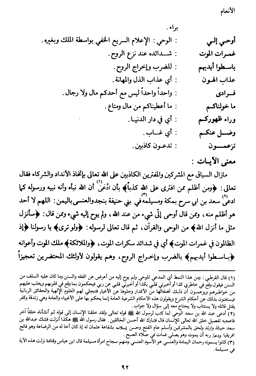 مازال السياق مع المشركين والمفترين الكاذبين على الله تعالى بإتخاذ الأنداد والشركاء فقال تعالى: {ومن أظلم ممن افترى على الله كذباً} بأن أدَّعى1 أن الله نبأه وأنه نبيه ورسوله كما ادعى سعد2 بن أبي سرح بمكة ومسيلمة3 في بني حنيفة بنجد والعنسى باليمن: اللهم لا أحد هو أظلم منه، وممن قال أوحى إلىّ شيء من عند الله، ولم يوح إليه شيء وممن قال: {سأنزل مثل ما أنزل الله} من الوحي والقرآن، ثم قال تعالى لرسوله: {ولو نرى} يا رسولنا {إذ الظالمون في غمرات الموت} أي في شدائد سكرات الموت، {والملائكة} ملك الموت وأعوانه {باسطوا أيديهم} بالضرب وإخراج الروح، وهم يقولون لأولئك المحتضرين تعجيزاً