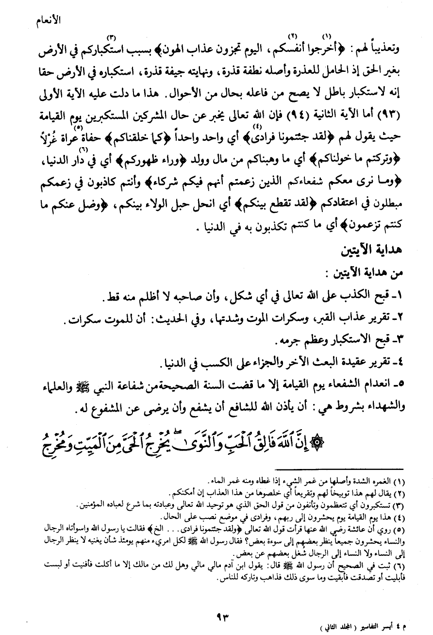 وتعذيباً لهم: {أخرجوا1 أنفسكم2، اليوم تجزون عذاب الهون} بسبب استكباركم3 في الأرض بغير الحق إذ الحامل للعذرة وأصله نطفة قذرة، ونهايته جيفة قذرة، استكباره في الأرض حقاً إنه استكبار باطل لا يصح من فاعله بحال من الأحوال. هذا ما دلت عليه الآية الأولى (93) أما الآية الثانية (94) فإن الله تعالى يخبر عن حال المشركين المستكبرين يوم القيامة حيث يقول لهم {لقد جئتمونا فرادى4} أي واحد واحداً {كما خلقناكم} حفاة5 عراة غُزْلاً {وتركتم ما خولناكم} أي ما وهبناكم من مال وولد {وراء ظهوركم} أي في دار6 الدنيا، {وما نرى معكم شفعاءكم الذين زعمتم أنهم فيكم شركاء، وأنتم كاذبون في زعمكم مبطلون في اعتقادكم {لقد نقطع بينكم} أي انحل حبل الولاء بينكم، {وضل عنكم ما كنتم تزعمون} أي ما كنتم تكذبون به في الدنيا.