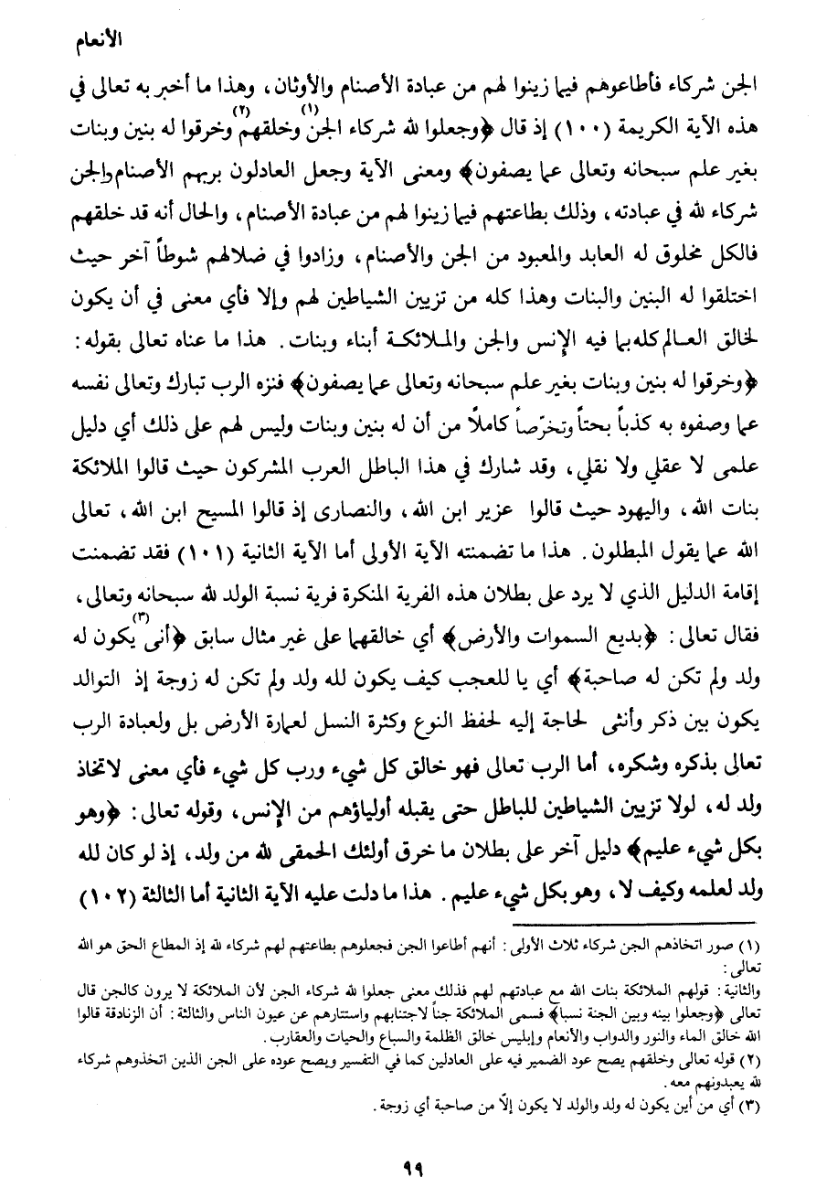 الجن شركاء فأطاعوهم فيما زينوا لهم من عبادة الأصنام والأوثان، وهذا ما أخبر به تعالى في هذه الآية الكريمة (100) إذ قال {وجعلوا لله شركاء الجن1 وخلقهم2 وخرقوا له بنين وبنات بغير علم سبحانه وتعالى عما يصفون} ومعنى الآية وجعل العادلون بربهم الأصنام والجن شركاء لله في عبادته، وذلك بطاعتهم فيما زينوا لهم من عبادة الأصنام، والحال أنه قد خلقهم فالكل مخلوق له العابد والمعبود من الجن والأصنام، وزادوا في ضلالهم شوطاً آخر حيث اختلقوا له البنين والبنات وهذا كله من تزيين الشياطين لهم وإلا فأي معنى في أن يكون لخالق العالم كله بما فيه الإنس والجن والملائكة أبناء وبنات. هذا ما عناه تعالى بقوله: {وخرقوا له بنين وبنات بغير علم سبحانه وتعالى عما يصفون} فنزه الرب تبارك وتعالى نفسه عما وصفوه به كذباً بحتاً وتخرّصاً كاملاً من أن له بنين وبنات وليس لهم على ذلك أي دليل علمي لا عقلي ولا نقلي، وقد شارك في هذا الباطل العرب المشركون حيث قالوا الملائكة بنات الله، واليهود حيث قالوا عزير ابن الله، والنصارى إذ قالوا المسيح ابن الله، تعالى الله عما يقول المبطلون. هذا ما تضمنته الآية الأولى أما الآية الثانية (101) فقد تضمنت إقامة الدليل الذي لا يرد على بطلان هذه الفرية المنكرة فرية نسبة الولد لله سبحانه وتعالى، فقال تعالى: {بديع السموات والأرض} أي خالقهما على غير مثال سابق {أنى3 يكون له ولد ولم تكن له صاحبة} أي يا للعجب كيف يكون لله ولد ولم تكن له زوجة إذ التوالد يكون بين ذكر وأنثى لحاجة إليه لحفظ النوع وكثرة النسل لعمارة الأرض بل ولعبادة الرب تعالى بذكره وشكره، أما الرب تعالى فهو خالق كل شيء ورب كل شيء فأي معنى لاتخاذ ولد له، لولا تزيين الشياطين للباطل حتى يقبله أولياؤهم من الإنس، وقوله تعالى: {وهو بكل شيء عليم} دليل آخر على بطلان ما خرق أولئك الحمقى لله من ولد، إذ لو كان لله ولد لعلمه وكيف لا، وهو بكل شيء عليم. هذا ما دلت عليه الآية الثانية أما الثالثة (102)