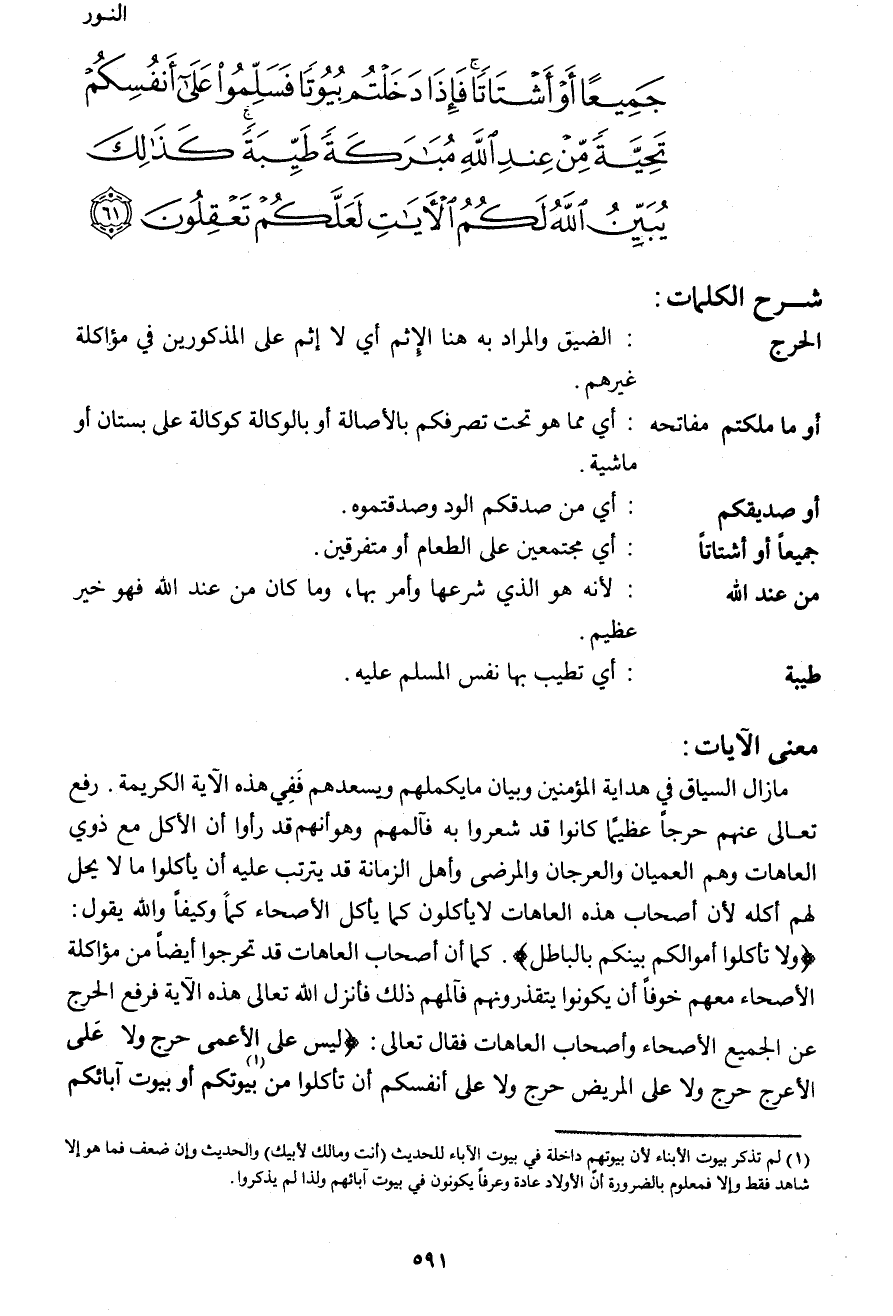 جَمِيعًا أَوْ أَشْتَاتًا فَإِذَا دَخَلْتُم بُيُوتًا فَسَلِّمُوا عَلَى أَنفُسِكُمْ تَحِيَّةً مِّنْ عِندِ اللهِ مُبَارَكَةً طَيِّبَةً كَذَلِكَ يُبَيِّنُ اللهُ لَكُمُ الآيَاتِ لَعَلَّكُمْ تَعْقِلُون (61)