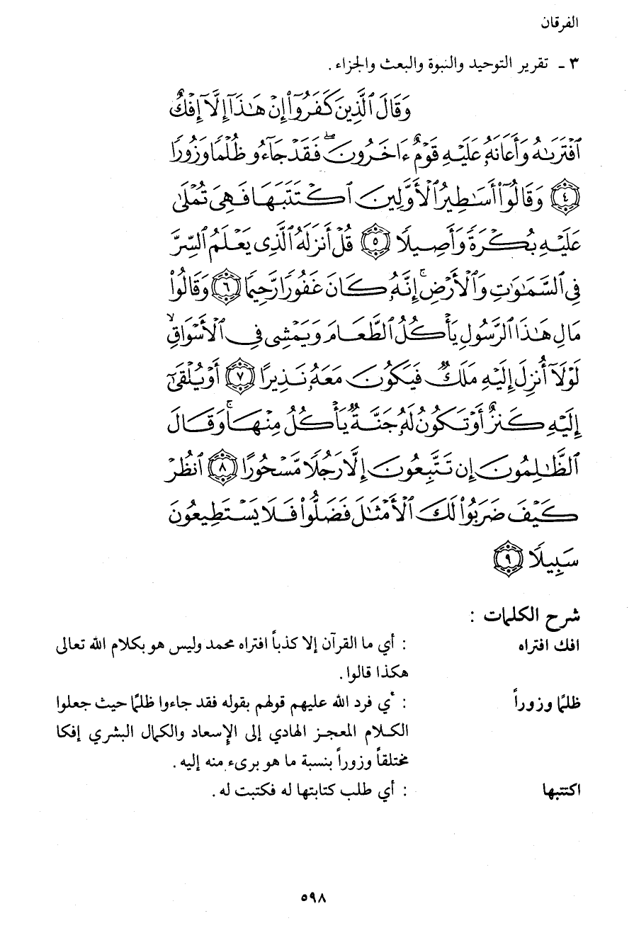 وَقَالَ الَّذِينَ كَفَرُوا إِنْ هَذَا إِلا إِفْكٌ افْتَرَاهُ وَأَعَانَهُ عَلَيْهِ قَوْمٌ آخَرُونَ فَقَدْ جَاؤُوا ظُلْمًا وَزُورًا (4) وَقَالُوا أَسَاطِيرُ الأوَّلِينَ اكْتَتَبَهَا فَهِيَ تُمْلَى عَلَيْهِ بُكْرَةً وَأَصِيلا (5) قُلْ أَنزَلَهُ الَّذِي يَعْلَمُ السِّرَّ فِي السَّمَاوَاتِ وَالأرْضِ إِنَّهُ كَانَ غَفُورًا رَّحِيمًا (6) وَقَالُوا مَالِ هَذَا الرَّسُولِ يَأْكُلُ الطَّعَامَ وَيَمْشِي فِي الأسْوَاقِ لَوْلا أُنزِلَ إِلَيْهِ مَلَكٌ فَيَكُونَ مَعَهُ نَذِيرًا (7) أَوْ يُلْقَى إِلَيْهِ كَنزٌ أَوْ تَكُونُ لَهُ جَنَّةٌ يَأْكُلُ مِنْهَا وَقَالَ الظَّالِمُونَ إِن تَتَّبِعُونَ إِلا رَجُلا مَّسْحُورًا (8) انظُرْ كَيْفَ ضَرَبُوا لَكَ الأمْثَالَ فَضَلُّوا فَلا يَسْتَطِيعُونَ سَبِيلا (9)