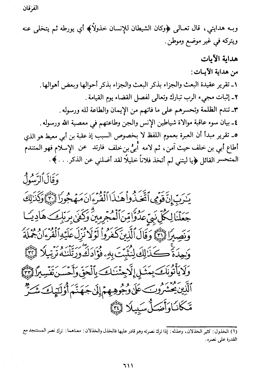 وَقَالَ الرَّسُولُ يَا رَبِّ إِنَّ قَوْمِي اتَّخَذُوا هَذَا الْقُرْآنَ مَهْجُورًا (30) وَكَذَلِكَ جَعَلْنَا لِكُلِّ نَبِيٍّ عَدُوًّا مِّنَ الْمُجْرِمِينَ وَكَفَى بِرَبِّكَ هَادِيًا وَنَصِيرًا (31) وَقَالَ الَّذِينَ كَفَرُوا لَوْلا نُزِّلَ عَلَيْهِ الْقُرْآنُ جُمْلَةً وَاحِدَةً كَذَلِكَ لِنُثَبِّتَ بِهِ فُؤَادَكَ وَرَتَّلْنَاهُ تَرْتِيلا (32) وَلا يَأْتُونَكَ بِمَثَلٍ إِلا جِئْنَاكَ بِالْحَقِّ وَأَحْسَنَ تَفْسِيرًا (33) الَّذِينَ يُحْشَرُونَ عَلَى وُجُوهِهِمْ إِلَى جَهَنَّمَ أُوْلَئِكَ شَرٌّ مَّكَانًا وَأَضَلُّ سَبِيلا (34)