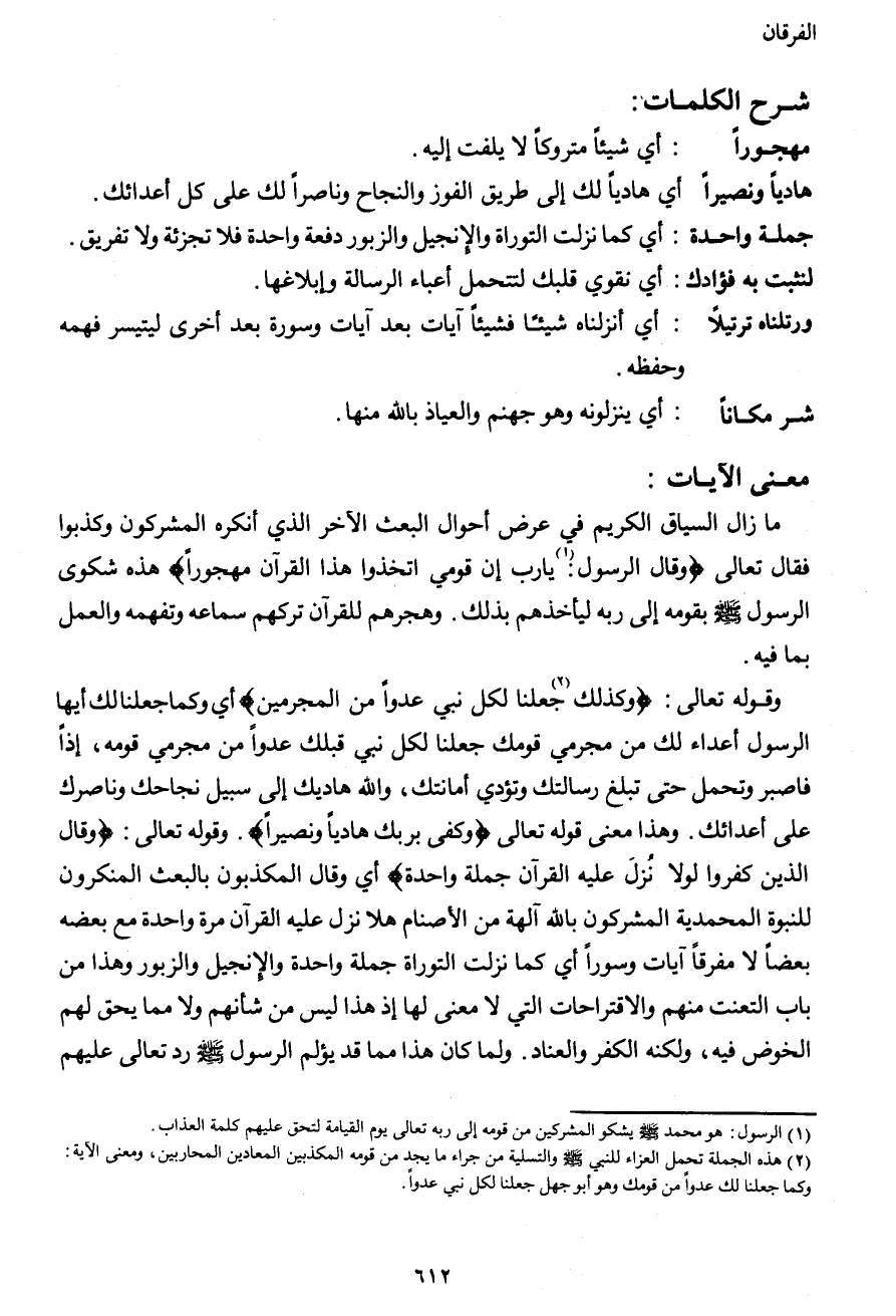 وقوله تعالى: {وكذلك2 جعلنا لكلى نبي عدواً من المجرمين} أي وكما جعلنا لك أيها الرسول أعداء لك من مجرمي قومك جعلنا لكل نبي قبلك عدواً من مجرمي قومه، إذاً فاصبر وتحمل حتى تبلغ رسالتك وتؤدي أمانتك، والله هاديك إلى سبيل نجاحك وناصرك على أعدائك. وهذا معنى قوله تعالى {وكفى بربك هادياً ونصيراً} . وقوله تعالى: {وقال الذين كفروا لولا نزل عليه القرآن جملة واحدة} أي وقال المكذبون بالبعث المنكرون للنبوة المحمدية المشركون بالله آلهة من الأصنام هلا نزل عليه القرآن مرة واحدة مع بعضه بعضاً لا مفرقاً آيات وسوراً أي كما نزلت التوراة جملة واحدة والإنجيل والزبور وهذا من باب التعنت منهم والاقتراحات التي لا معنى لها إذ هذا ليس من شأنهم ولا مما يحق لهم الخوض فيه، ولكنه الكفر والعناد. ولما كان هذا مما قد يؤلم الرسول صَلَّى اللهُ عَلَيْهِ وَسَلَّمَ رد تعالى عليهم