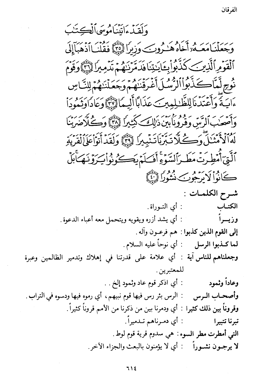 وَلَقَدْ آتَيْنَا مُوسَى الْكِتَابَ وَجَعَلْنَا مَعَهُ أَخَاهُ هَارُونَ وَزِيرًا (35) فَقُلْنَا اذْهَبَا إِلَى الْقَوْمِ الَّذِينَ كَذَّبُوا بِآيَاتِنَا فَدَمَّرْنَاهُمْ تَدْمِيرًا (36) وَقَوْمَ نُوحٍ لَّمَّا كَذَّبُوا الرُّسُلَ أَغْرَقْنَاهُمْ وَجَعَلْنَاهُمْ لِلنَّاسِ آيَةً وَأَعْتَدْنَا لِلظَّالِمِينَ عَذَابًا أَلِيمًا (37) وَعَادًا وَثَمُودَ وَأَصْحَابَ الرَّسِّ وَقُرُونًا بَيْنَ ذَلِكَ كَثِيرًا (38) وَكُلا ضَرَبْنَا لَهُ الأمْثَالَ وَكُلا تَبَّرْنَا تَتْبِيرًا (39) وَلَقَدْ أَتَوْا عَلَى الْقَرْيَةِ الَّتِي أُمْطِرَتْ مَطَرَ السَّوْءِ أَفَلَمْ يَكُونُوا يَرَوْنَهَا بَلْ كَانُوا لا يَرْجُونَ نُشُورًا (40)