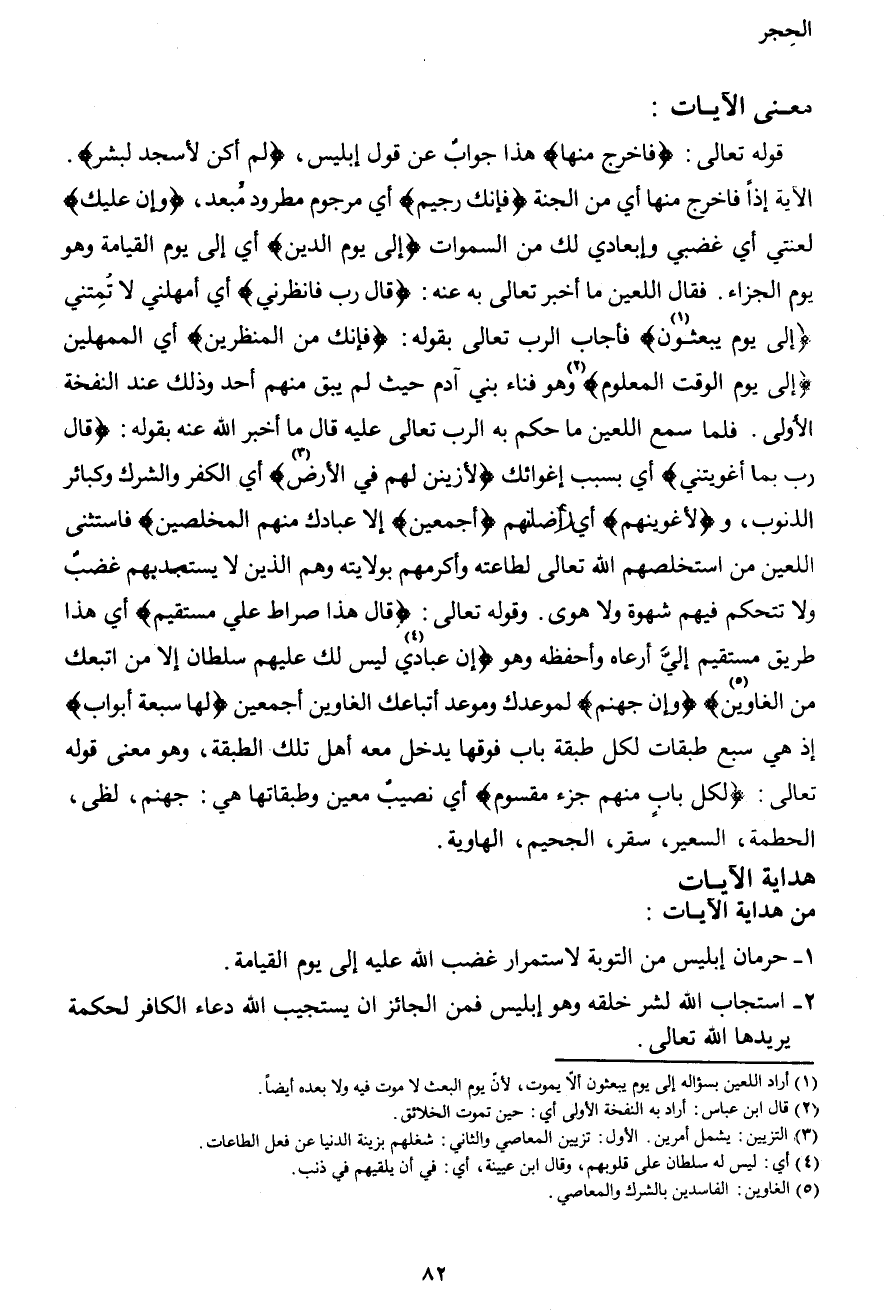 قوله تعالى: {فاخرج منها} هذا جوابٌ عن قول إبليس، {لم أكن لأسجد لبشر} . الآية إذاً فاخرج منها أي من الجنة {فإنك رجيم} أي مرجوم مطرود مبعد، {وإن عليك} لعنتي أي غضبي وإبعادي لك من السموات {إلى يوم الدين} أي إلى يوم القيامة وهو يوم الجزاء. فقال اللعين ما أخبر تعالى به عنه: {قال رب فانظرني} أي أمهلني لا تمتني {إلى يوم يبعثون1} فأجاب الرب تعالى بقوله: {فإنك من المنظرين} أي الممهلين {إلى يوم الوقت المعلوم2} وهو فناء بني آدم حيث لم يبق منهم أحد وذلك عند النفخة الأولى. فلما سمع اللعين ما حكم به الرب تعالى عليه قال ما أخبر الله عنه بقوله: {قال رب بما أغويتني} أي بسبب إغوائك {لأزينن لهم في الأرض3} أي الكفر والشرك وكبائر الذنوب، و {لأغوينهم} أي لأضلنّهم {أجمعين إلا عبادك منهم المخلصين} فاستثنى اللعين من استخلصهم الله تعالى لطاعته وأكرمهم بولايته وهم الذين لا يَسْتَبِدُّ بهم غضبٌ ولا تتحكم فيهم شهوة ولا هوى. وقوله تعالى: {قال هذا صراط علي مستقيم} أي هذا طريق مستقيم إليَّ أرعاه وأحفظه وهو {إن عبادي4 ليس لك عليهم سلطان إلا من اتبعك من الغاوين5} {وإن جهنم} لموعدك وموعد أتباعك الغاوين أجمعين {لها سبعة أبواب} إذ هي سبع طبقات لكل طبقة باب فوقها يدخل معه أهل تلك الطبقة، وهو معنى قوله تعالى: {لكل باب منهم جزء مقسوم} أي نصيبٌ معين وطبقاتها هي: جهنم، لظى، الحطمة، السعير، سقر، الجحيم، الهاوية.