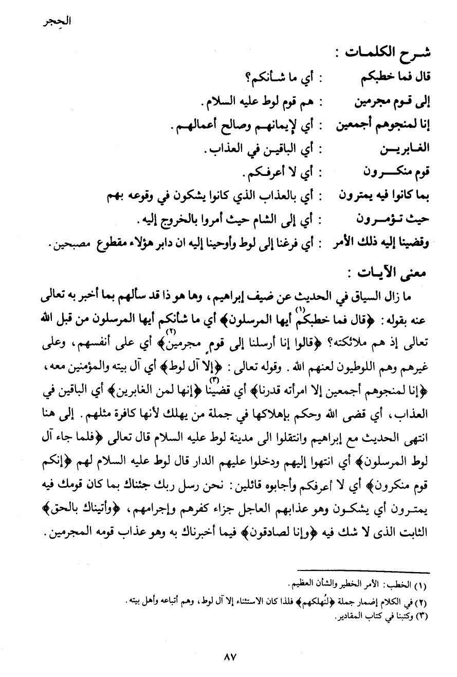 ما زال السياق في الحديث عن ضيف إبراهيم، وها هو ذا قد سألهم بما أخبر به تعالى عنه بقوله: {قال فما خطبكم1 أيها المرسلون} أي ما شأنكم أيها المرسلون من قبل الله تعالى إذ هم ملائكته {قالوا إنا أرسلنا إلى قوم مجرمين2} أي على أنفسهم، وعلى غيرهم وهم اللوطيون لعنهم الله. قوله تعالى: {إلا آل لوط} آل بيته والمؤمنين معه، {إنا لمنجوهم أجمعين إلا امرأته قدرنا} أي قضينا3 {إنها لمن الغابرين} أي الباقين في العذاب، أي قضى الله وحكم بإهلاكها في جملة من يهلك لأنها كافرة مثلهم. إلى هنا انتهى الحديث مع إبراهيم وانتقلوا إلى مدينة لوط عليه السلام قال تعالى {فلما جآء آل لوط المرسلون} أي انتهوا إليهم ودخلوا عليهم الدار قال لوط عليه السلام لهم {إنكم قوم منكرون} أي لا أعرفكم وأجابوه قائلين: نحن رسل ربك جئناك بما كان قومك فيه يمترون أي يشكون وهو عذابهم العاجل جزاء كفرهم وإجرامهم، {وأتيناك بالحق} الثابت الذي لا شك فيه {وإنا لصادقون} فيما أخبرناك به وهو عذاب قومه المجرمين.