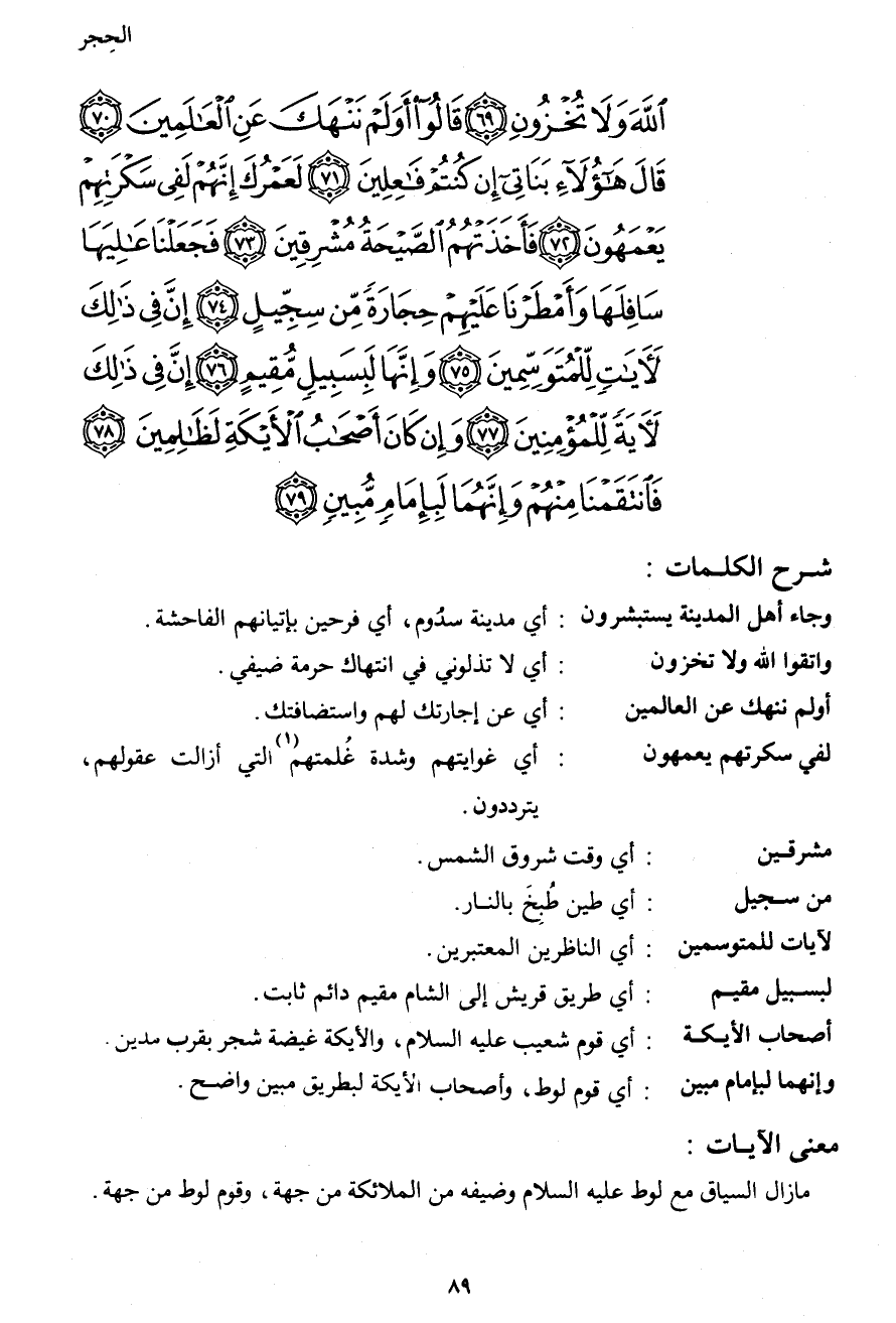 اللهَ وَلاَ تُخْزُونِ (69) قَالُوا أَوَلَمْ نَنْهَكَ عَنِ الْعَالَمِينَ (70) قَالَ هَؤُلاء بَنَاتِي إِن كُنتُمْ فَاعِلِينَ (71) لَعَمْرُكَ إِنَّهُمْ لَفِي سَكْرَتِهِمْ يَعْمَهُونَ (72) فَأَخَذَتْهُمُ الصَّيْحَةُ مُشْرِقِينَ (73) فَجَعَلْنَا عَالِيَهَا سَافِلَهَا وَأَمْطَرْنَا عَلَيْهِمْ حِجَارَةً مِّن سِجِّيلٍ (74) إِنَّ فِي ذَلِكَ لآيَاتٍ لِّلْمُتَوَسِّمِينَ (75) وَإِنَّهَا لَبِسَبِيلٍ مُّقيمٍ (76) إِنَّ فِي ذَلِكَ لآيَةً لِّلْمُؤمِنِينَ (77) وَإِن كَانَ أَصْحَابُ الأَيْكَةِ لَظَالِمِينَ (78) فَانتَقَمْنَا مِنْهُمْ وَإِنَّهُمَا لَبِإِمَامٍ مُّبِينٍ (79)