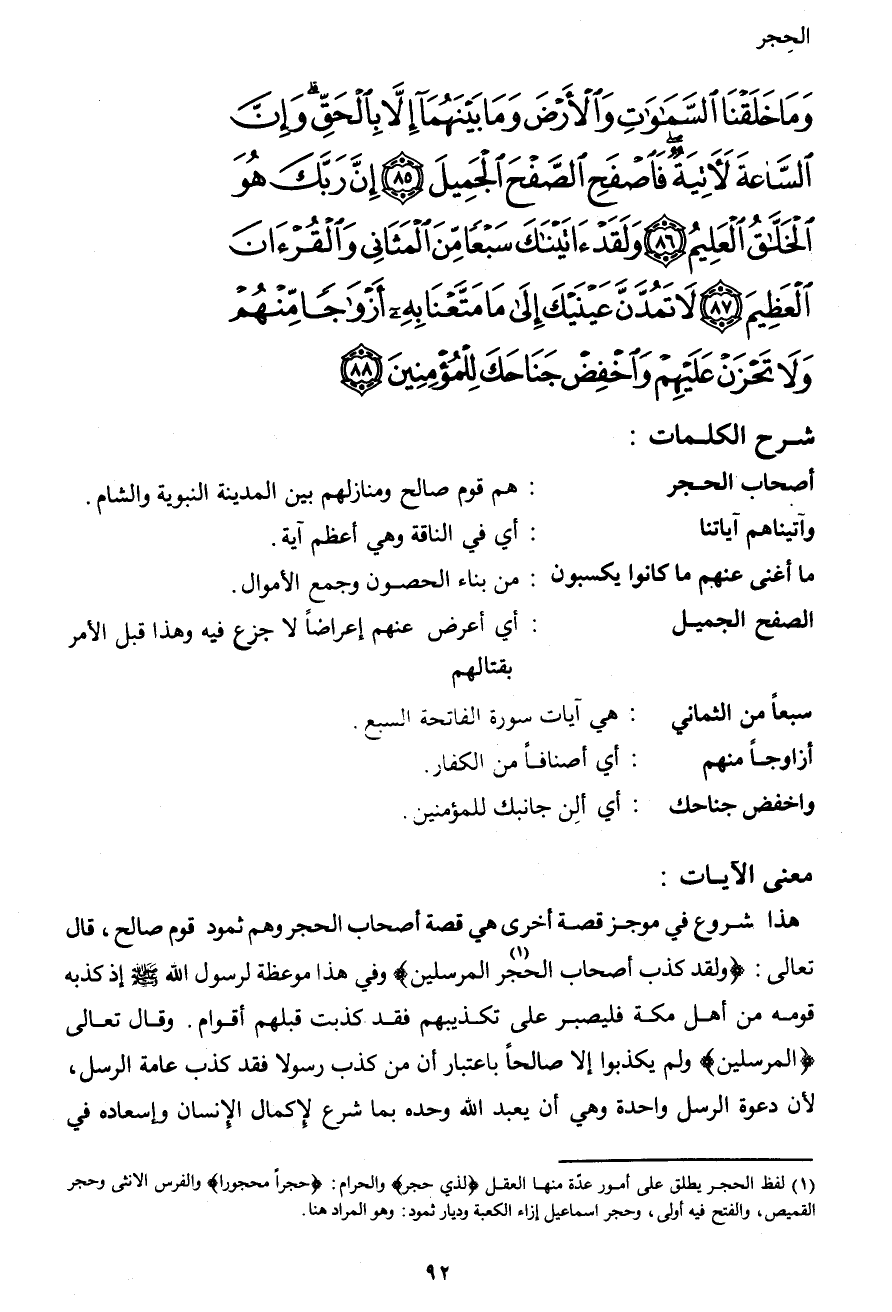 1 لفظ الحجر يطلق على أمور عدّة منها العقل {لذي حجر} والحرام: {حجراً محجوراً} والفرس الانثى وحجر القميص، والفتح فيه أولى، وحجر إسماعيل إزاء الكعبة وديار ثمود: وهو المراد هنا.