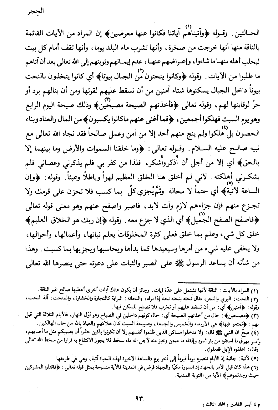 الحالتين. وقوله {وآتيناهم1 آياتنا فكانوا عنها معرضين} إن المراد من الآيات القائمة بالناقة منها أنها خرجت من صخرة، وأنها تشرب ماء البلد يوما، وأنها تقف أمام كل بيت ليحلب أهله منها ما شاءوا، وإعراضهم عنها، عدم إيمانهم وتوبتهم إلى الله تعالى بعد أن آتاهم ما طلبوا من الآيات. وقوله {وكانوا ينحتون2 من الجبال بيوتا} أي كانوا يتخذون بالنحت بيوتاً داخل الجبال يسكنوها شتاء آمنين من أن تسقط عليهم لقوتها وست أن ينالهم برد أو حر لوقايتها لهم، وقوله تعالى {فأخذتهم الصيحة مصبحين3} وذلك صيحة اليوم الرابع وهو يوم السبت فهلكوا أجمعين، {فما أغنى عنهم ما كانوا يكسبون} من المال والعتاد وبناء الحصون بل4 هلكوا ولم ينج منهم أحد إلا من آمن وعمل صالحاً فقد نجاه الله تعالى مع نبيه صالح عليه السلام. وقوله تعالى: {وما خلقنا السموات والأرض وما بينهما إلا بالحق} أي إلا من أجل أن أُذكر وأُشكر، فلذا من كفر بي فلم يذكرني وعصاني فلم يشكرني أهلكته. لأني لم أخلق عدا الخلق العظيم لهواً وباطلاً وعبثاً. وقوله: {وإن الساعة لآتية5} أي حتماً لا محالة وثم يُجزي كلٌ بما كسب فلا تحزن على قومك ولا تجزع منهم فإن جزاءهم لازم وآت لابد، فاصبر واصفح عنهم وهو معنى قوله تعالى {فاصفح الصفح الجميل6} أي الذي لا جزع معه. وقوله {إن ربك هو الخلاق العليم} خلق كل شيء وعلم بما خلق فعلى كثرة المخلوقات يعلم نياتها، وأعمالها، وأحوالها، ولا يخفى عليه شيء من أمرها وسيعيدها كما بدأها ويحاسبها ويجزيها بما كسبت. وهذا من شأنه أن يساعد الرسول صَلَّى اللهُ عَلَيْهِ وَسَلَّمَ على الصبر والثبات على دعوته حتى ينصرها الله تعالى