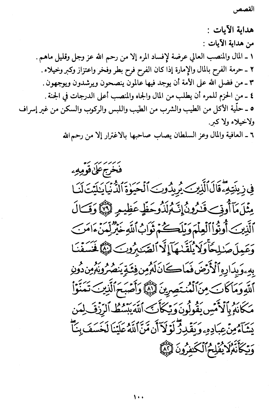 وَقَالَ الَّذِينَ أُوتُوا الْعِلْمَ وَيْلَكُمْ ثَوَابُ اللهِ خَيْرٌ لِمَنْ آمَنَ وَعَمِلَ صَالِحاً وَلا يُلَقَّاهَا إِلَّا الصَّابِرُونَ (80) فَخَسَفْنَا بِهِ وَبِدَارِهِ الْأَرْضَ فَمَا كَانَ لَهُ مِنْ فِئَةٍ يَنْصُرُونَهُ مِنْ دُونِ اللهِ وَمَا كَانَ مِنَ الْمُنْتَصِرِينَ (81) وَأَصْبَحَ الَّذِينَ تَمَنَّوْا مَكَانَهُ بِالْأَمْسِ يَقُولُونَ وَيْكَأَنَّ اللهَ يَبْسُطُ الرِّزْقَ لِمَنْ يَشَاءُ مِنْ عِبَادِهِ وَيَقْدِرُ لَوْلا أَنْ مَنَّ اللهُ عَلَيْنَا لَخَسَفَ بِنَا وَيْكَأَنَّهُ لا يُفْلِحُ الْكَافِرُونَ (82)