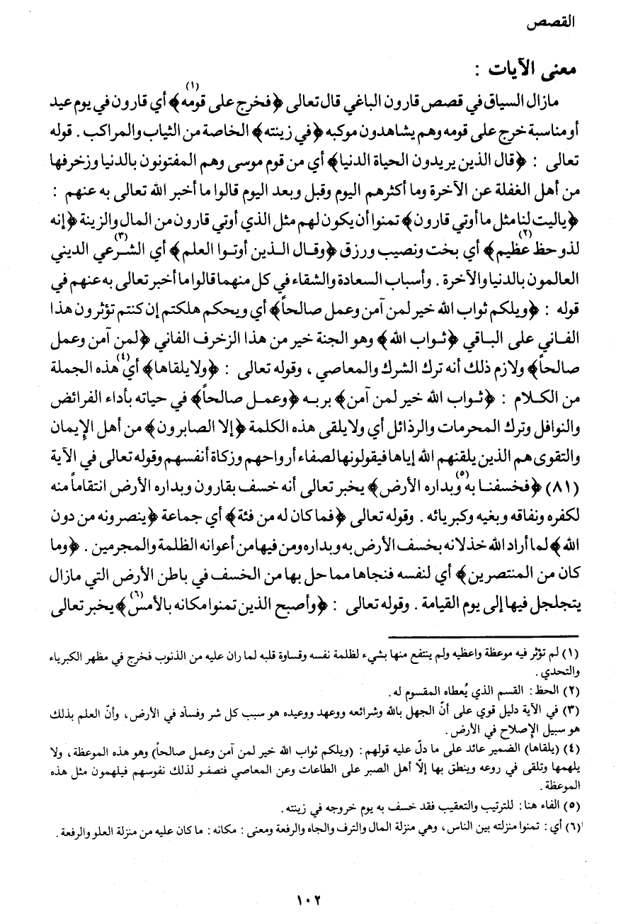 ما زال السياق في قصص قارون الباغي قال تعالى {فَخَرَجَ عَلَى قَوْمِهِ (1) } أي قارون في يوم عيد أو مناسبة خرج على قومه وهم يشاهدون موكبه {فِي زِينَتِهِ} الخاصة من الثياب والمراكب. قوله تعالى: {قَالَ الَّذِينَ يُرِيدُونَ الْحَيَاةَ الدُّنْيَا} أي من قوم موسى وهم المفتونون بالدنيا وزخرفها من أهل الغفلة عن الآخرة وما أكثرهم اليوم وقبل وبعد اليوم قالوا ما أخبر الله به عنهم: {يَا لَيْتَ لَنَا مِثْلَ مَا أُوتِيَ قَارُونُ} تمنوا أن يكون لهم مثل الذي أوتي قارون من المال والزينة {إِنَّهُ لَذُو حَظٍّ (2) عَظِيمٍ} أي بخت ونصيب ورزق {وَقَالَ الَّذِينَ أُوتُوا الْعِلْمَ} أي الشرعي (3) الديني العالمون بالدنيا والآخرة، وأسباب السعادة والشقاء في كل منهما قالوا ما أخبر الله تعالى به عنهم في قوله: {وَيْلَكُمْ ثَوَابُ اللهِ خَيْرٌ لِمَنْ آمَنَ وَعَمِلَ صَالِحاً} ويحكم هلكتم إن كنتم تؤثرن هذا الفاني على الباقي {ثَوَابُ اللهِ} وهو الجنة خير من هذا الزخرف الفاني {لِمَنْ آمَنَ وَعَمِلَ صَالِحاً} ولازم ذلك أنه ترك الشرك والمعاصي، وقوله تعالى: {وَلا يُلَقَّاهَا} أي (4) هذه الجملة من الكلام: {ثَوَابُ اللهِ خَيْرٌ لِمَنْ آمَنَ} بربه {وَعَمِلَ صَالِحاً} في حياته بأداء الفرائض والنوافل وترك المحرمات والرذائل أي لا يلقى هذه الكلمة {إِلَّا الصَّابِرُونَ} من أهل الإيمان والتقوى هم الذين يلقنهم الله إياها فيقولونها الصفاء أرواحهم وزكاة أنفسهم وقوله تعالى في الآية (81) {فَخَسَفْنَا بِهِ (5) وَبِدَارِهِ الْأَرْضَ} يخبر تعالى أنه خسف بقارون وبداره الأرض انتقاما منه لكفره ونفاقه وبغيه وكبريائه. وقوله تعالى {فَمَا كَانَ لَهُ مِنْ فِئَةٍ} أي جماعة {يَنْصُرُونَهُ مِنْ دُونِ اللهِ} لما أراد الله خذلانه بخسف الأرض به وبداره ومن فيها من أعوانه الظلمة والمجرمين. {وَمَا كَانَ مِنَ الْمُنْتَصِرِينَ} أي لنفسه فنجاها مما حل بها من الخسف في باطن الأرض التي ما زال يتجلجل فيها إلى يوم القيامة. وقوله تعالى: {وَأَصْبَحَ الَّذِينَ تَمَنَّوْا مَكَانَهُ بِالْأَمْسِ} (6) يخبر تعالى