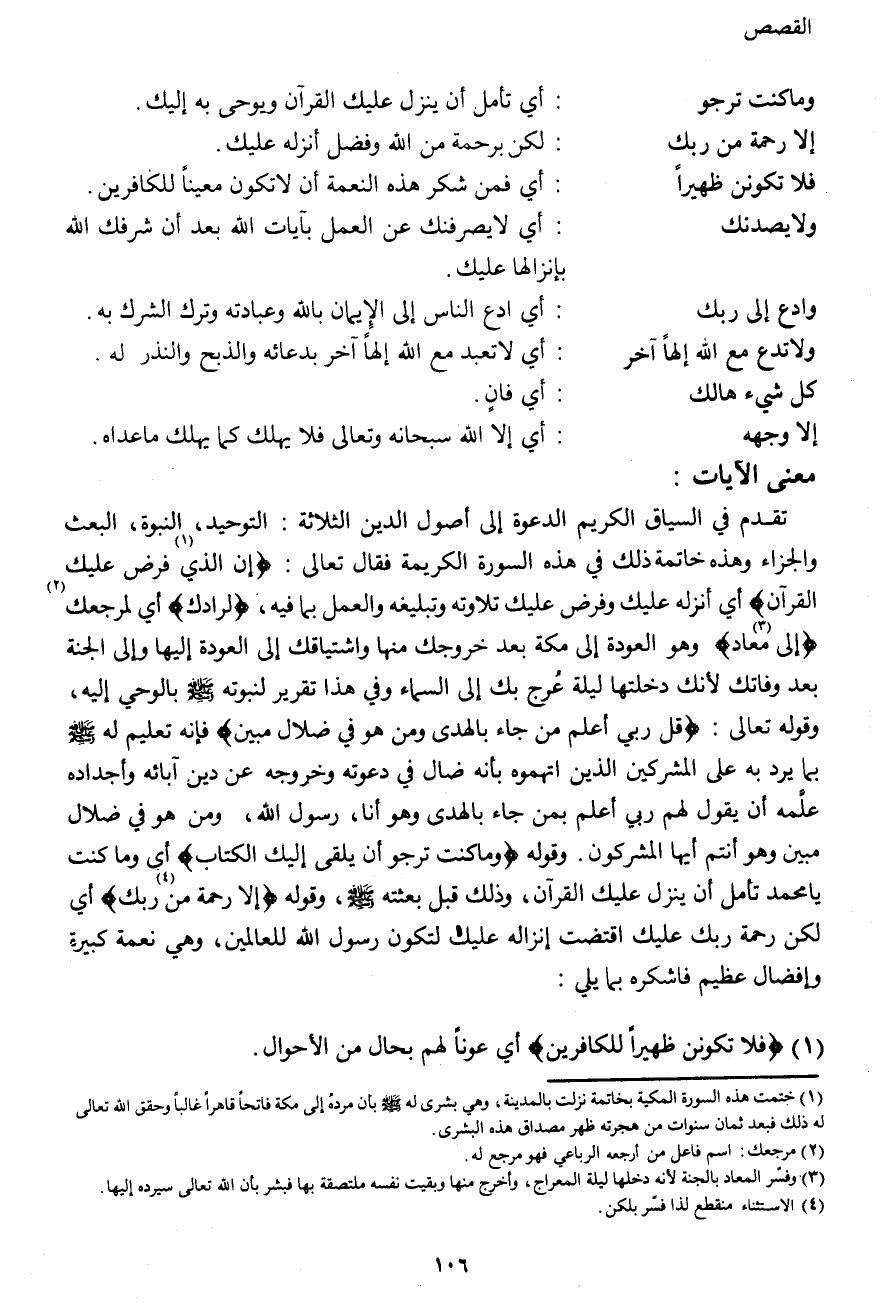 تقدم في السياق الكريم الدعوة إلى أصول الدين الثلاثة: التوحيد، والنبوة، والبعث والجزاء وهذه خاتمة ذلك في هذه السورة الكريمة فقال تعالى: {إِنَّ الَّذِي (1) فَرَضَ عَلَيْكَ الْقُرْآنَ} أي أنزله عليك وفرض عليك تلاوته وتبليغه والعمل بما فيه، {لَرَادُّكَ} أي لمرجعك (2) {إِلَى مَعَادٍ (3) } وهو العودة إلى مكة بعد خروجك منها واشتياقك إلى العودة إليها وإلى الجنة بعد وفاتك لأنك دخلتها ليلة عُرج بك إلى السماء وفي هذا تقرير لنبوته صَلَّى اللهُ عَلَيْهِ وَسَلَّمَ بالوحي إليه، وقوله تعالى: {قُلْ رَبِّي أَعْلَمُ مَنْ جَاءَ بِالْهُدَى وَمَنْ هُوَ فِي ضَلالٍ مُبِينٍ} فإنه تعليم له صَلَّى اللهُ عَلَيْهِ وَسَلَّمَ بما يرد به على المشركين الذين اتهموه بأنه ضال في دعوته وخروجه عن دين آبائه وأجداده علَّمه أن يقول لهم ربي أعلم بمن جاء بالهدى وهو أنا، رسول الله، ومن هو في ضلال مبين وهو أنتم أيها المشركون. وقوله {وَمَا كُنْتَ تَرْجُو أَنْ يُلْقَى إِلَيْكَ الْكِتَابُ} أي وما كنت يا محمد تأمل أن ينزل عليك القرآن، وذلك قبل بعثته صَلَّى اللهُ عَلَيْهِ وَسَلَّمَ، وقوله {إِلَّا رَحْمَةً مِنْ (4) رَبِّكَ} أي لكن رحمة ربك عليك اقتضت إنزاله عليك لتكون رسول الله للعالمين، وهي نعمة كبيرة وإفضال عظيم فاشكره بما يلي: