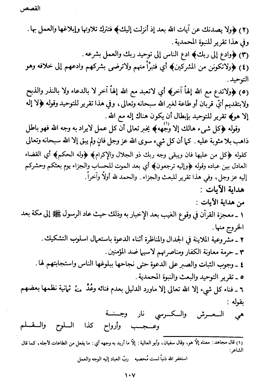وقوله {كُلُّ شَيْءٍ هَالِكٌ إِلَّا وَجْهَهُ (1) } يخبر تعالى أن كل عمل لا يراد به وجه الله فهو باطل ذاهب بلا مثوبة عليه. كما أن كل شيء سوى الله عز وجل فانٍ ولم يبق إلا الله سبحانه وتعالى كقوله {كُلُّ مَنْ عَلَيْهَا فَانٍ وَيَبْقَى وَجْهُ رَبِّكَ ذُو الْجَلالِ وَالْأِكْرَامِ} و {لَهُ الْحُكْمُ} أي القضاء العادل بين عباده وقوله {وَإِلَيْهِ تُرْجَعُونَ} أي بعد الموت للحساب والجزاء يوم بعثكم وحشركم إليه عز وجل، وفي هذا تقرير للبعث والجزاء. والحمد لله أولاً وآخراً.