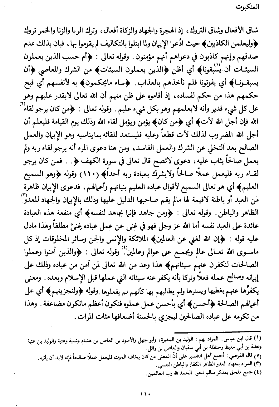 شاق الأفعال وشاق التروك، إذ الهجرة والجهاد والزكاة أفعال، وترك الربا والزنا والخمر تروك {وَلَيَعْلَمَنَّ الْكَاذِبِينَ} حيث ادعوا الإيمان ولما ابتلوا بالتكاليف لم يقوموا بها، فبان بذلك عدم صدقهم وإنهم كاذبون في دعواهم أنهم مؤمنون. وقوله تعالى: {أَمْ حَسِبَ الَّذِينَ يَعْمَلُونَ السَّيِّئَاتِ أَنْ يَسْبِقُونَا (1) } أي أظن {يَعْمَلُونَ السَّيِّئَاتِ} من الشرك والمعاصي {أَنْ يَسْبِقُونَا} أي يفوتونا فلم نأخذهم بالعذاب. {سَاءَ مَا يَحْكُمُونَ} به لأنفسهم أي قبح حكمهم هذا من حكم لفساده، إذ أقاموه على ظن منهم أن الله تعالى لا يقدر عليهم وهو على كل شيء قدير وأنه لا يعلمهم وهو بكل شيء عليم. وقوله تعالى: {مَنْ كَانَ يَرْجُو لِقَاءَ (2) اللهِ فَإِنَّ أَجَلَ اللهِ لَآتٍ} أي {مَنْ كَانَ} يؤمن ويؤمل لقاء الله وذلك يوم القيامة فليعلم أن أجل الله المضروب لذلك لآت قطعا وعليه فليستعد للقائه بما يناسبه وهو الإيمان والعمل الصالح بعد التخلي عن الشرك والعمل الفاسد، ومن هنا دعوى المرء أنه يرجو لقاء ربه ولم يعمل صالحاً يثاب عليه، دعوى لا تصح قال تعالى في سورة الكهف {.. فَمَنْ كَانَ يَرْجُوا لِقَاءَ رَبِّهِ فَلْيَعْمَلْ عَمَلاً صَالِحاً وَلا يُشْرِكْ بِعِبَادَةِ رَبِّهِ أَحَداً} (110) وقوله {وَهُوَ السَّمِيعُ الْعَلِيمُ} أي هو تعالى السميع لأقوال عباده العليم بنياتهم وأعمالهم، فدعوى الإيمان ظاهرة من العبد أو باطنة لا قيمة لها ما لم يقم صاحبها الدليل عليها وذلك بالإيمان الجهاد للعدو (3) الظاهر والباطن. وقوله تعالى: {وَمَنْ جَاهَدَ فَإِنَّمَا يُجَاهِدُ لِنَفْسِهِ} أي منفعة هذه العبادة عائدة على العبد نفسه أما الله عز وجل فهو في غنى عن عمل عباده غنىً مطلقاً وهذا ما دل عليه قوله: {إِنَّ اللهَ لَغَنِيٌّ عَنِ الْعَالَمِينَ} الملائكة والإنس والجن وسائر المخلوقات إذ كل ما سوى الله تعالى عالم ويجمع على عوالم وعالمين (4) . وقوله تعالى: {وَالَّذِينَ آمَنُوا وَعَمِلُوا الصَّالِحَاتِ لَنُكَفِّرَنَّ عَنْهُمْ سَيِّئَاتِهِمْ} هذا وعد من الله تعالى لمن آمن من عباده وذلك على إيمانه وصالح عمله فعلاً وتركاً بأنه يكفر عنه سيئاته التي عملها قبل الإسلام وبعده. ومعنى يكفّرها عنهم يغطيها ويسترها ولم يطالبهم بها كأنهم لم يفعلوها. وقوله {وَلَنَجْزِيَنَّهُمْ} أي على أعمالهم الصالحة {أَحْسَنَ} أي بأحسن عمل عملوه فتكون أعظم ما تكون مضاعفة. وهذا من تكرمه على عباده الصالحين ليجزي بالحسنة أضعافها مئات المرات.