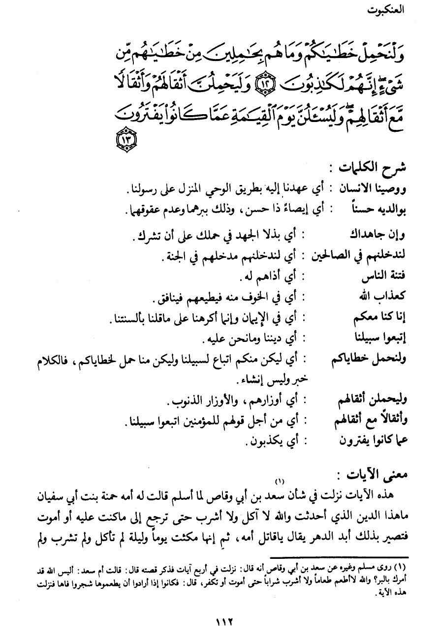 هذه الآيات نزلت فى شأن (1) سعد بن أبي وقاص لما أسلم قالت له أمه حمنة بنت أبي سفيان ما هذا الدين الذي أحدثت والله لا آكل ولا أشرب حتى ترجع إلى ما كنت عليه أو أموت فتُعيّر بذلك أبد الدهر يقال يا قاتل أمه، ثم إنها مكثت يوماً وليلة لم تأكل ولم تشرب ولم