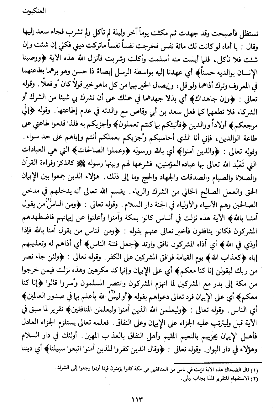 تستظل فأصبحت وقد جهدت ثم مكثت يوما آخر وليلة لم تأكل ولم تشرب فجاء سعد إليها وقال: يا أماه لو كانت لك مائة نفس فخرجت نفسا نفساً ما تركت ديني فكلي إن شئت وإن شئت فلا تأكلي، فلما أيست منه أسلمت وأكلت وشربت فأنزل الله هذه الآية {وَوَصَّيْنَا الْإِنْسَانَ بِوَالِدَيْهِ حُسْناً} أي عهدنا إليه بواسطة الرسل إيصاءً ذا حسن وهو برهما بطاعتهما في المعروف وترك أذاهما ولو قل، وإيصال الخير بهما من كل ما هو خير قولاً كان أو فعلاً. وقوله تعالى: {وَإِنْ جَاهَدَاكَ} أي بذلا جهدهما في حملك على أن تشرك بي شيئاً من الشرك أو الشركاء فلا تطعهما كما فعل سعد بن أبي وقاص مع والدته في عدم إطاعتها. وقوله {إِلَيَّ مَرْجِعُكُمْ} أولاداً ووالدين {فَأُنَبِّئُكُمْ بِمَا كُنْتُمْ تَعْمَلُونَ} وأجزيكم به فلذا قدموا طاعتي على طاعة الوالدين، فإني أنا الذي أحاسبكم وأجزيكم بعملكم أنتم وإياهم على حد سواء. وقوله تعالى: {وَالَّذِينَ آمَنُوا} أي بالله ورسوله {وَعَمِلُوا الصَّالِحَاتِ} التي هي العبادات التي تعبّد الله تعالى بها عباده المؤمنين، فشرعها لهم وبينها رسوله صَلَّى اللهُ عَلَيْهِ وَسَلَّمَ كالذكر وقراءة القرآن والصلاة والصيام والصدقات والجهاد والحج وما إلى ذلك. هؤلاء الذين جمعوا بين الإيمان الحق والعمل الصالح الخالي من الشرك والرياء. يقسم الله تعالى أنه يدخلهم في مدخل الصالحين وهم الأنبياء والأولياء في الجنة دار السلام. وقوله تعالى: {وَمِنَ النَّاسِ (1) مَنْ يَقُولُ آمَنَّا بِاللهِ} الآية هذه نزلت في أناس كانوا بمكة وآمنوا وأعلنوا عن إيمانهم فاضطهدهم المشركون فكانوا ينافقون فأخبر تعالى عنهم بقوله: {مَنْ يَقُولُ آمَنَّا بِاللهِ فَإِذَا أُوذِيَ فِي اللهِ} أي آذاه المشركون نافق وارتد {جَعَلَ فِتْنَةَ النَّاسِ} أي أذاهم له وتعذيبهم إياه {كَعَذَابِ اللهِ} يوم القيامة فوافق المشركين على الكفر. وقوله تعالى: {وَلَئِنْ جَاءَ نَصْرٌ مِنْ رَبِّكَ لَيَقُولُنَّ إِنَّا كُنَّا مَعَكُمْ} أي على الإيمان وإنما كنا مكرهين وهذه نزلت فيمن خرجوا من مكة إلى بدر مع المشركين لما انهزم المشركون وانتصر المسلمون وأسروا قالوا {إِنَّا كُنَّا مَعَكُمْ} أي على الإيمان فرد الله تعالى دعواهم بقوله {أَوَلَيْسَ (2) اللهُ بِأَعْلَمَ بِمَا فِي صُدُورِ الْعَالَمِينَ} أي الناس. وقوله تعالى: {وَلَيَعْلَمَنَّ اللهُ الَّذِينَ آمَنُوا وَلَيَعْلَمَنَّ الْمُنَافِقِينَ} تقرير لما سبق في الآية قبل وليترتب عليه الجزاء على الإيمان وعلى النفاق. فعلمه تعالى يستلزم الجزاء العادل فأهل الإيمان يجزيهم بالنعيم المقيم وأهل النفاق يجزيهم بالعذاب المهين. أولئك في دار السلام وهؤلاء في دار البوار. وقوله تعالى: {وَقَالَ الَّذِينَ كَفَرُوا لِلَّذِينَ آمَنُوا اتَّبِعُوا سَبِيلَنَا} أي ديننا