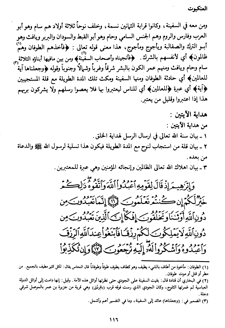 ومن معه في السفينة، وكانوا قرابة الثمانين نسمة، وخلف نوحاً ثلاثة أولا هم سام وهو أبو العرب وفارس والروم وهم الجنس السامي وحام وهو أبو القبط والسودان والبربر ويافث وهو أبو الترك والصقالبة ويأجوج ومأجوج، هذا معنى قوله تعالى: {فَأَخَذَهُمُ الطُّوفَانُ وَهُمْ (1) ظَالِمُونَ} أي لأنفسهم بالشرك. {َأَنْجَيْنَاهُ وَأَصْحَابَ السَّفِينَةِ (2) } ومن بين ما فيها أبناؤه الثلاثة سام وحام ويافث ومنهم عمر الكون بالبشر شرقا وغربا وشمالا وجنوباً وقوله {وَجَعَلْنَاهَا آيَةً (3) لِلْعَالَمِينَ} أي حادثة الطوفان ومنها السفينة ومكث تلك المدة الطويلة مع قلة المستجيبين {آيَةً} أي عبرة {لِلْعَالَمِينَ} أي للناس ليعتبروا بها فلا يعصوا رسلهم ولا يشركون بربهم هذا إذا اعتبروا وقليل من يعتبر.