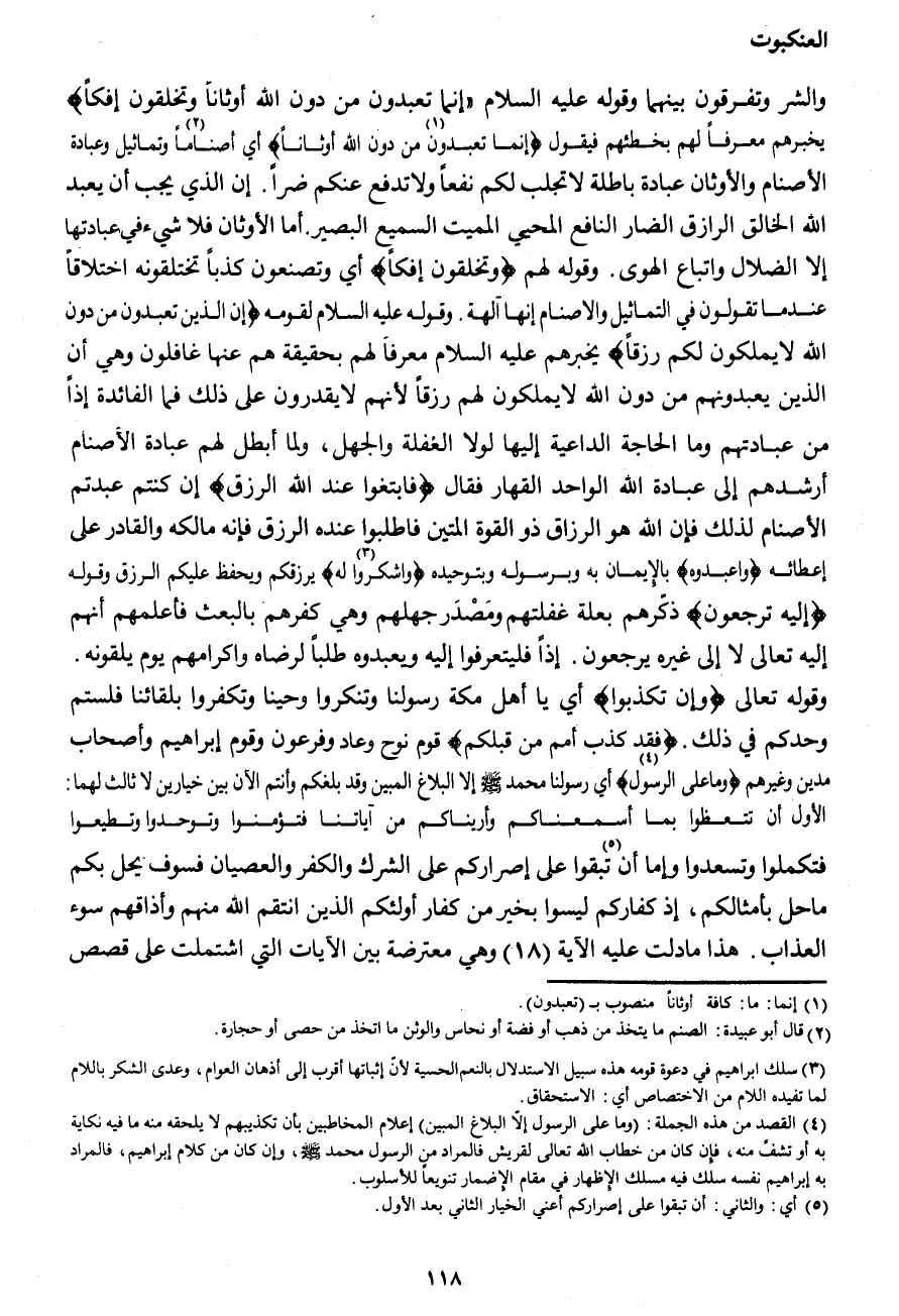 والشر وتفرقون بينهما وقوله عليه السلام {إِنَّمَا تَعْبُدُونَ مِنْ دُونِ اللهِ أَوْثَاناً وَتَخْلُقُونَ إِفْكاً} يخبرهم معرفا لهم بخطئهم فيقول {إِنَّمَا تَعْبُدُونَ (1) مِنْ دُونِ اللهِ أَوْثَاناً} أي أصناماً (2) وتماثيل وعبادة الأصنام والأوثان عبادة باطلة لا تجلب لكم نفعا ولا تدفع عنكم ضراً. إن الذي يجب أن يعبد الخالق الرازق الضار النافع المحيي المميت السميع البصير. أما الأوثان فلا شيء في عبادتها إلا الضلال واتباع الهوى. وقوله لهم {وَتَخْلُقُونَ إِفْكاً} أي وتصنعون كذبا تختلقونه اختلاقاً عندما تقولون في التماثيل والأصنام إنها آلهة. وقوله عليه السلام لقومه {إِنَّ الَّذِينَ تَعْبُدُونَ مِنْ دُونِ اللهِ لا يَمْلِكُونَ لَكُمْ رِزْقاً} يخبرهم عليه السلام معرفا لهم بحقيقة هم عنها غافلون وهي أن الذين يعبدونهم من دون الله لا يملكون لهم رزقاً لأنهم لا يقدرون على ذلك فما الفائدة إذاً من عبادتهم وما الحاجة الداعية إليها لولا الغفلة والجهل، ولما أبطل لهم عبادة الأصنام أرشدهم إلى عبادة الله الواحد القهار فقال {فَابْتَغُوا عِنْدَ اللهِ الرِّزْقَ} إن كنتم عبدتم الأصنام لذلك فإن الله هو الرزاق ذو القوة المتين فاطلبوا عنده الرزق فإنه مالكه والقادر على إعطائه {وَاعْبُدُوهُ} بالإيمان به وبرسوله وبتوحيده {وَاشْكُرُوا لَهُ (3) } يرزقكم ويحفظ عليكم الرزق وقوله {إِلَيْهِ تُرْجَعُونَ} ذكّرهم بعلة غفلتهم ومصدر جهلهم وهي كفرهم بالبعث فأعلمهم أنهم إليه تعالى لا إلى غيره يرجعون. إذاً فليتعرفوا إليه ويعبدوه طلبا لرضاه وإكرامهم يوم يلقونه. وقوله تعالى {وَإِنْ تُكَذِّبُوا} أي يا أهل مكة رسولنا وتنكروا وحينا وتكفروا بلقائنا فلستم وحدكم في ذلك {فَقَدْ كَذَّبَ أُمَمٌ مِنْ قَبْلِكُمْ} قوم نوح وعاد وفرعون وقوم إبراهيم وأصحاب مدين وغيرهم {وَمَا عَلَى الرَّسُولِ (4) } أي رسولنا محمد صَلَّى اللهُ عَلَيْهِ وَسَلَّمَ {إِلَّا الْبَلاغُ الْمُبِينُ} وقد بلغكم وأنتم الآن بين خيارين لا ثالث لهما: الأول أن تتعظوا بما أسمعناكم وأريناكم من آياتنا فتؤمنوا وتوحدوا وتطيعوا فتكملوا وتسعدوا وإما أن (5) تبقوا على إصراركم على الشرك والكفر العصيان فسوف يحل بكم ما حل بأمثالكم، إذ كفاركم ليسو بخير من كفار أولئكم الذين انتقم الله منهم وأذاقهم سوء العذاب. هذا ما دلت عليه الآية (18) وهي معترضة بين الآيات التي اشتملت على قصص