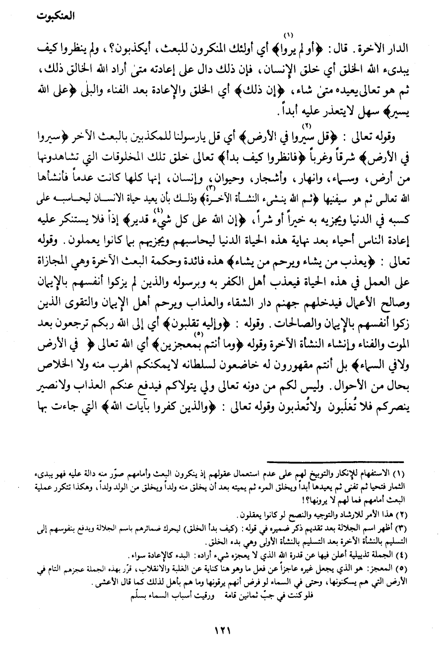 وقوله تعالى: {قُلْ (2) سِيرُوا فِي الْأَرْضِ} أي قل يا رسولنا للمكذبين بالبعث الآخر {سِيرُوا فِي الْأَرْضِ} شرقاً وغرباً {فَانْظُرُوا كَيْفَ بَدَأَ الْخَلْقَ} تعالى خلق تلك المخلوقات التي تشاهدونها من أرض، وسماء، وأنهار، وأشجار، وحيوان، وإنسان، إنها كلها كانت عدما فأنشأها الله تعالى ثم هو سيفنيها {ثُمَّ اللهُ يُنْشِئُ النَّشْأَةَ الْآخِرَةَ (3) } وذلك بأن يعيد حياة الإنسان ليحاسبه على كسبه في الدنيا ويجزيه به خيراً أو شراً، {إِنَّ اللهَ عَلَى كُلِّ شَيْءٍ (4) قَدِيرٌ} إذاً فلا يستنكر عليه إعادة الناس أحياء بعد نهاية هذه الحياة الدنيا ليحاسبهم ويجزيهم بما كانوا يعملون. وقوله تعالى: {يُعَذِّبُ مَنْ يَشَاءُ وَيَرْحَمُ مَنْ يَشَاءُ} هذه فائدة وحكمة البعث الآخرة وهي المجازاة على العمل في هذه الحياة فيعذب أهل الكفر به وبرسوله والذين لم يزكوا أنفسهم بالإيمان وصالح الأعمال فيدخلهم في جهنم دار الشقاء والعذاب ويرحم أهل الإيمان والتقوى الذين زكوا أنفسهم بالإيمان والصالحات. وقوله: {وَإِلَيْهِ تُقْلَبُونَ} أي إلى الله ربكم ترجعون بعد الموت والفناء وإنشاء النشأة الآخرة وقوله {وَمَا أَنْتُمْ بِمُعْجِزِينَ (5) } أي الله تعالى {فِي الْأَرْضِ وَلا فِي السَّمَاءِ} بل أنتم مقهورون له خاضعون لسلطانه لا يمكنكم من الهروب منه ولا الخلاص بحال من الأحوال. وليس لكم من دونه تعالى ولي يتولاكم فيدفع عنكم العذاب ولا نصير ينصركم فلا تُغلبون ولا تعذبون وقوله تعالى: {وَالَّذِينَ كَفَرُوا بِآياتِ اللهِ} التي جاءت بها