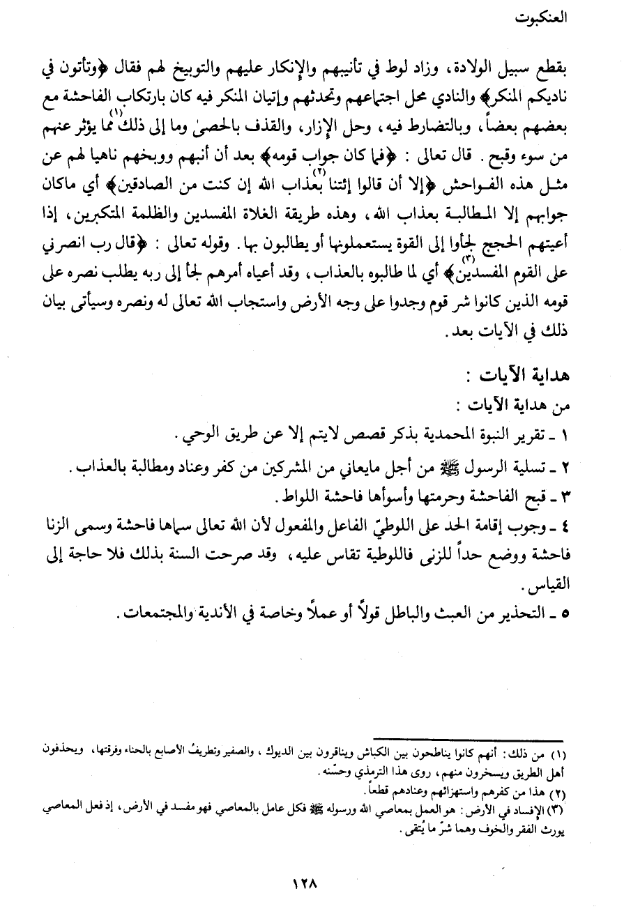 بقطع سبيل الولادة، وزاد لوط في تأنيبهم والإنكار عليهم والتوبيخ لهم فقال {وَتَأْتُونَ فِي نَادِيكُمُ الْمُنْكَرَ} والنادي محل اجتماعهم وتحدثهم وإتيان المنكر فيه كان بارتكاب الفاحشة مع بعضهم بعضا، وبالتضارط فيه، وحل الإزار، والقذف بالحصى وما إلى ذلك (1) مما يؤثر عنهم من سوء وقبح. قال تعالى: {فَمَا كَانَ جَوَابَ قَوْمِهِ} بعد أن أنّبهم ووبخهم ناهيا لهم عن مثل هذه الفواحش {إِلَّا أَنْ قَالُوا ائْتِنَا (2) بِعَذَابِ اللهِ إِنْ كُنْتَ مِنَ الصَّادِقِينَ} أي ما كان جوابهم إلا المطالبة بعذاب الله، وهذه طريقة الغلاة المفسدين والظلمة المتكبرين، إذا أعيتهم الحجج لجأوا إلى القوة يستعملونها أو يطالبون بها. وقوله تعالى: {قَالَ رَبِّ انْصُرْنِي عَلَى الْقَوْمِ الْمُفْسِدِينَ (3) } أي لما طالبوه بالعذاب، وقد أعياه أمرهم لجأ إلى ربه يطلب نصره على قومه الذين كانوا شر قوم وجدوا على وجه الأرض واستجاب الله تعالى له ونصره وسيأتي بيان ذلك في الآيات بعد.