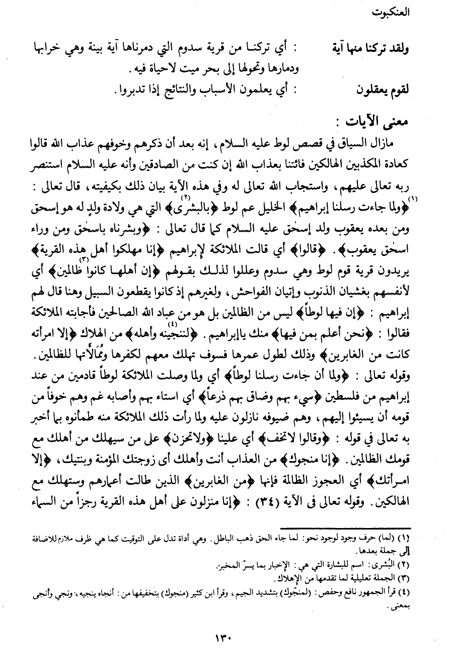 ما زال السياق في قصص لوط عليه السلام، إنه بعد أن ذكرهم وخوفهم عذاب الله قالوا كعادة المكذبين الهالكين فائتتنا بعذاب الله إن كنت من الصادقين وأنه عليه السلام استنصر ربه تعالى عليهم، واستجاب الله تعالى له وفي هذه الآية بيان ذلك بكيفيته، قال تعالى: {وَلَمَّا (1) جَاءَتْ رُسُلُنَا إِبْرَاهِيمَ} الخليل عم لوط {بِالْبُشْرَى (2) } التي هي ولادة ولدٍ له هو إسحاق ومن بعده يعقوب ولد إسحاق عليه السلام كما قال تعالى: {فَبَشَّرْنَاهَا بِإِسْحَاقَ وَمِنْ وَرَاءِ إِسْحَاقَ يَعْقُوبَ} . {قَالُوا} أي قالت الملائكة لإبراهيم {إِنَّا مُهْلِكُو أَهْلِ هَذِهِ الْقَرْيَةِ} يريدون قرية قوم لوط وهي سدوم وعللوا لذلك بقولهم {إِنَّ أَهْلَهَا (3) كَانُوا ظَالِمِينَ} أي لأنفسهم بغشيان الذنوب وإتيان الفواحش، ولغيرهم إذ كانوا يقطعون السبيل وهنا قال لهم إبراهيم: {إِنَّ فِيهَا لُوطاً} ليس من الظالمين بل هو من عباد الله الصالحين فأجابته الملائكة فقالوا: {قَالُوا نَحْنُ أَعْلَمُ بِمَنْ فِيهَا} منك يا إبراهيم. {لَنُنَجِّيَنَّهُ (4) وَأَهْلَهُ} من الهلاك {إِلَّا امْرَأَتَهُ كَانَتْ مِنَ الْغَابِرِينَ} وذلك لطول عمرها فسوف تهلك معهم لكفرها وممالأتها للظالمين. وقوله تعالى: {وَلَمَّا أَنْ جَاءَتْ رُسُلُنَا لُوطاً} أي ولما وصلت الملائكة لوطاً قادمين من عند إبراهيم من فلسطين {سِيءَ بِهِمْ وَضَاقَ بِهِمْ ذَرْعاً} أي استاء بهم وأصابه غم وهم خوفاً من قومه أن يسيئوا إليهم، وهم ضيوفه نازلون عليه ولما رأت ذلك الملائكة منه طمأنوه بما أخبر به تعالى في قوله: {وَقَالُوا لا تَخَفْ} أي علينا {وَلا تَحْزَنْ} على من سيهلك من أهلك مع قومك الظالمين. {إِنَّا مُنَجُّوكَ} من العذاب أنت وأهلك أي زوجتك المؤمنة وبنتيك، {إِلَّا امْرَأَتَكَ} أي العجوز الظالمة فإنها {مِنَ الْغَابِرِينَ} الذين طالت أعمارهم وستهلك مع الهالكين. وقوله تعالى في الآية (34) : {إِنَّا مُنْزِلُونَ عَلَى أَهْلِ هَذِهِ الْقَرْيَةِ رِجْزاً مِنَ السَّمَاءِ
