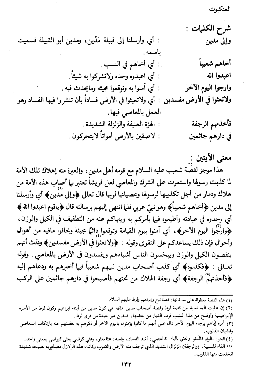 هذا موجز لقصة (1) شعيب عليه السلام مع قومه أهل مدين، والعبرة منه إهلاك تلك الأمة لما كذبت رسولها واستمرت على الشرك والمعاصي لعل قريشاً تعتبر بما أصاب هذه الأمة من هلاك ودمار من أجل تكذيبها لرسولها وعصيانها لربها قال تعالى {وَإِلَى (2) مَدْيَنَ} أي وأرسلنا إلى مدين {أَخَاهُمْ شُعَيْباً} وهو نبيّ عربي فلما انتهى إليهم برسالته قال {يَا قَوْمِ اعْبُدُوا اللهَ} أي وحدوه في عبادته وأطيعوه فيما يأمركم به وينهاكم عنه من التطفيف في الكيل والوزن، {وَارْجُوا (3) الْيَوْمَ الْآخِرَ} ، أي آمنوا بيوم القيامة وتوقعوا دائماً مجيئه وخافوا ما فيه من أهوال وأحوال فإن ذلك يساعدكم على التقوى وقوله: {وَلا تَعْثَوْا (4) فِي الْأَرْضِ مُفْسِدِينَ} وذلك أنهم ينقصون الكيل والوزن ويبخسون الناس أشياءهم ويفسدون في الأرض بالمعاصي. وقوله تعالى: {فَكَذَّبُوهُ} أي كذب أصحاب مدين نبيهم شعيباً فيما أخبرهم به ودعاهم إليه {فَأَخَذَتْهُمُ (5) الرَّجْفَةُ} أي رجفة الهلاك من تحتهم فأصبحوا في دارهم جاثمين على الركب