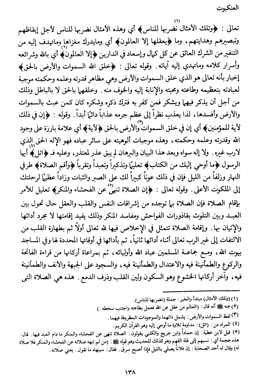 تعالى: {وَتِلْكَ الْأَمْثَالُ (1) نَضْرِبُهَا لِلنَّاسِ} أي وهذه الأمثال نضربها للناس لأجل إيقاظهم وتبصيرهم وهدايتهم، {وَمَا يَعْقِلُهَا إِلَّا الْعَالِمُونَ} أي وما يدرك مغزاها وما تهدف إليه من التنفير من الشرك العائق عن كل كمال وإسعاد في الدارين {إِلَّا الْعَالِمُونَ (2) } أي بالله وشرائعه وأسرار كلامه وما تهدي إليه آياته. وقوله تعالى: {خَلَقَ اللهُ السَّمَاوَاتِ وَالْأَرْضَ بِالْحَقِّ} إخبار بأنه تعالى هو الذي خلق السموات والأرض وهي مظاهر قدرته وعلمه وحكمته موجبة لعبادته بتعظيمه وطاعته ومحبته والإنابة إليه والخوف منه. وخلقهما بالحق لا بالباطل وذلك من أجل أن يذكر فيهما ويشكر فمن كفر به فترك ذكره وشكره كان كمن عبث بالسموات والأرض وأفسدها، لذا يعذب نظراً إلى عظم جرمه عذاباً دائماً أبداً. وقوله: {إِنَّ فِي ذَلِكَ لَآيَةً لِلْمُؤْمِنِينَ} أي إن في خلق السموات (3) والأرض بالحق {لَآيَةً} أي علامة بارزة على وجود الله وقدرته وعلمه وحكمته، وهذه موجبات ألوهيته على سائر عباده فهو الإله الحق الذي لا رب غيره ولا إله سواه. وبعد هذا البيان والبرهان لم يبق عذر لمعتذر، وعليه فـ {اتْلُ (4) } أيها الرسول {مَا أُوحِيَ إِلَيْكَ مِنَ الْكِتَابِ} تعليماً وتذكيراً وتعبداً وتقرباً {وَأَقِمِ الصَّلاةَ} طرفي النهار وزلفاً من الليل فإن في ذلك عوناً كبيراً لك على الصبر والثبات وزاداً عظيماً لرحلتك إلى الملكوت الأعلى. وقوله تعالى: {إِنَّ الصَّلاةَ تَنْهَى (5) عَنِ الْفَحْشَاءِ وَالْمُنْكَرِ} تعليل للأمر بإقام الصلاة فإن الصلاة بما توجده من إشراقات النفس والقلب والعقل حال تحول بين العبد وبين التلوث بقاذورات الفواحش ومفاسد المنكر وذلك يفيد إقامتها لا مجرد أدائها والإتيان بها. وإقامة الصلاة تتمثل في الإخلاص فيها لله تعالى أولاً ثم بطهارة القلب من الالتفات إلى غير الرب تعالى أثناء أدائها ثانياً، ثم بأدائها في أوقاتها المحددة لها وفي المساجد بيوت الله، ومع جماعة المسلمين عباد الله وأوليائه، ثم بمراعاة أركانها من قراءة الفاتحة والركوع والطمأنينة فيه والاعتدال والطمأنينة فيه، والسجود على الجبهة والأنف والطمأنينة فيه، وآخر أركانها الخشوع وهو السكون ولين القلب وذرف الدمع. هذه هي الصلاة التي