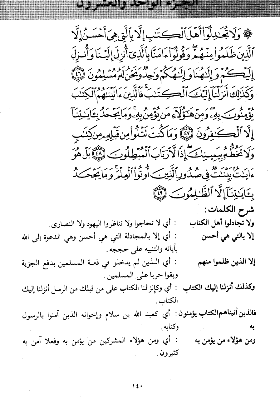 وَلا تُجَادِلُوا أَهْلَ الْكِتَابِ إِلَّا بِالَّتِي هِيَ أَحْسَنُ إِلَّا الَّذِينَ ظَلَمُوا مِنْهُمْ وَقُولُوا آمَنَّا بِالَّذِي أُنْزِلَ إِلَيْنَا وَأُنْزِلَ إِلَيْكُمْ وَإِلَهُنَا وَإِلَهُكُمْ وَاحِدٌ وَنَحْنُ لَهُ مُسْلِمُونَ (46) وَكَذَلِكَ أَنْزَلْنَا إِلَيْكَ الْكِتَابَ فَالَّذِينَ آتَيْنَاهُمُ الْكِتَابَ يُؤْمِنُونَ بِهِ وَمِنْ هَؤُلاءِ مَنْ يُؤْمِنُ بِهِ وَمَا يَجْحَدُ بِآياتِنَا إِلَّا الْكَافِرُونَ (47) وَمَا كُنْتَ تَتْلُو مِنْ قَبْلِهِ مِنْ كِتَابٍ وَلا تَخُطُّهُ بِيَمِينِكَ إِذاً لارْتَابَ الْمُبْطِلُونَ (48) بَلْ هُوَ آيَاتٌ بَيِّنَاتٌ فِي صُدُورِ الَّذِينَ أُوتُوا الْعِلْمَ وَمَا يَجْحَدُ بِآياتِنَا إِلَّا الظَّالِمُونَ (49)