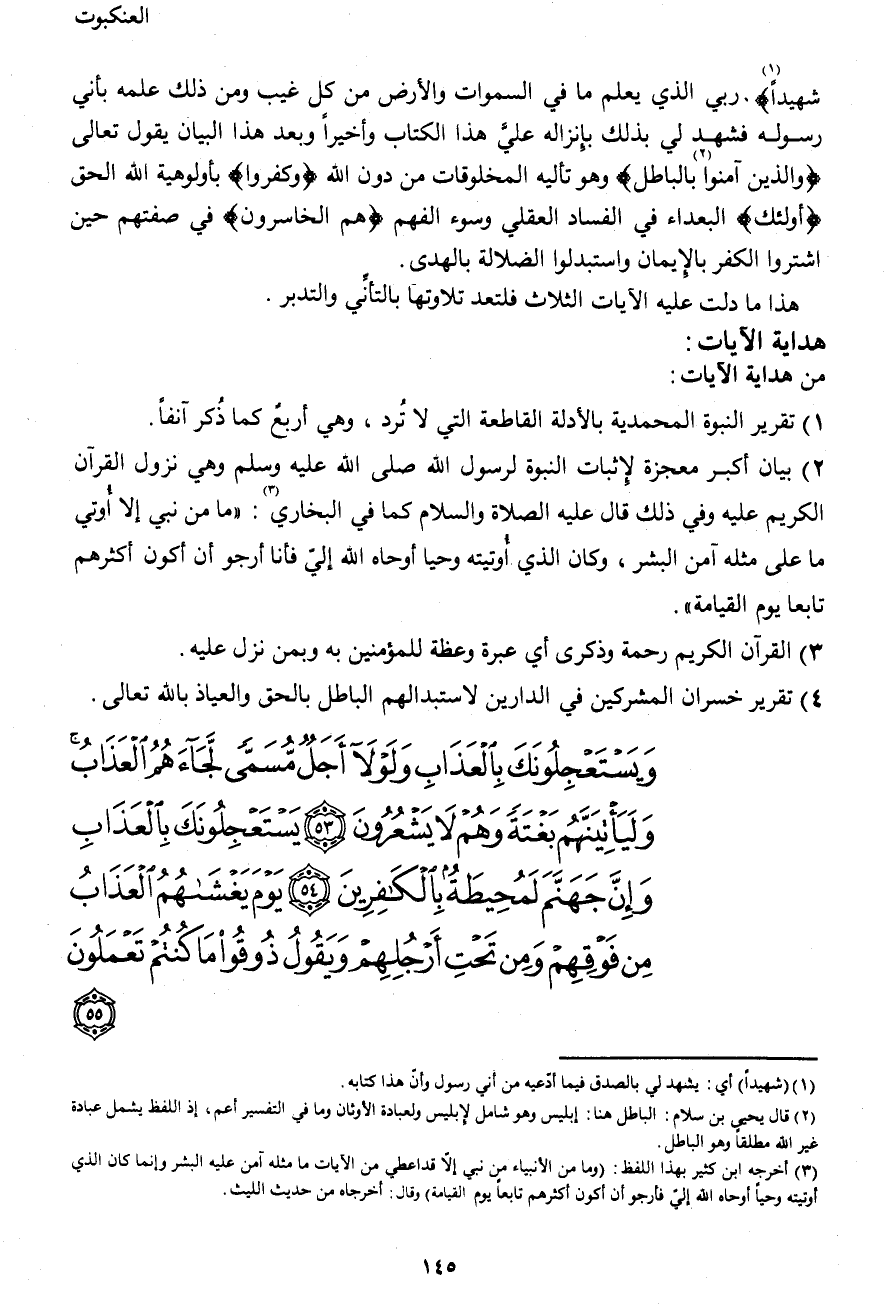 شَهِيداً (1) } ربي الذي يعلم ما في السموات والأرض من كل غيب ومن ذلك علمه بأني رسوله فشهد لي بذلك بإنزاله عليّ هذا الكتاب وأخيراً وبعد هذا البيان يقول تعالى {وَالَّذِينَ آمَنُوا (2) بِالْبَاطِلِ} وهو تأليه المخلوقات من دون الله {وَكَفَرُوا} بألوهية الله الحق {أُولَئِكَ} البعداء في الفساد العقلي وسوء الفهم {هُمُ الْخَاسِرُونَ} في صفتهم حين اشتروا الكفر بالإيمان واستبدلوا الضلالة بالهدى.