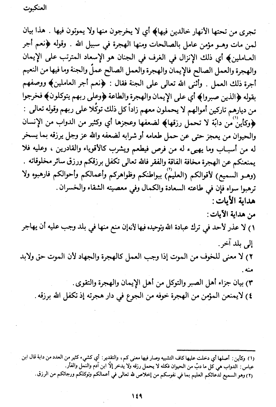 تَجْرِي مِنْ تَحْتِهَا الْأَنْهَارُ خَالِدِينَ فِيهَا} أي لا يخرجون منها ولا يموتون فيها. هذا بيان لمن مات وهو مؤمن عامل بالصالحات ومنها الهجرة في سبيل الله. وقوله {نِعْمَ أَجْرُ الْعَامِلِينَ} أي ذلك الإنزال في الغرف في الجنان هو الإسعاد المترتب على الإيمان والهجرة والعمل الصالح فالإيمان والهجرة والعمل الصالح عملٌ والجنة وما فيها من النعيم أجرة ذلك العمل. وأثنى الله تعالى على الجنة فقال: {نِعْمَ أَجْرُ الْعَامِلِينَ} ووصفهم بقوله {الَّذِينَ صَبَرُوا} أي على الإيمان والهجرة والطاعة {وَعَلَى رَبِّهِمْ يَتَوَكَّلُونَ} فخرجوا من ديارهم تاركين أموالهم لا يحملون معهم زاداً كل ذلك توكلا على ربهم وقوله تعالى: {وَكَأَيِّنْ (1) مِنْ دَابَّةٍ لا تَحْمِلُ رِزْقَهَا} لضعفها وعجزها أي وكثير من الدواب من الإنسان والحيوان مَن يعجز حتى عن حمل طعامه أو شرابه لضعفه والله عز وجل يرزقه بما يسخر له من أسباب وما يهيئ له من فرص فيطعم ويشرب كالأقوياء والقادرين، وعليه فلا يمنعنكم عن الهجرة مخافة الفاقة والفقر فالله تعالى تكفل برزقكم ورزق سائر مخلوقاته. {وَهُوَ السَّمِيعُ} لأقوالكم {الْعَلِيمُ (2) } ببواطنكم وظواهركم وأعمالكم وأحوالكم فارهبوه ولا ترهبوا سواه فإن في طاعته السعادة والكمال وفي معصيته الشقاء والخسران.