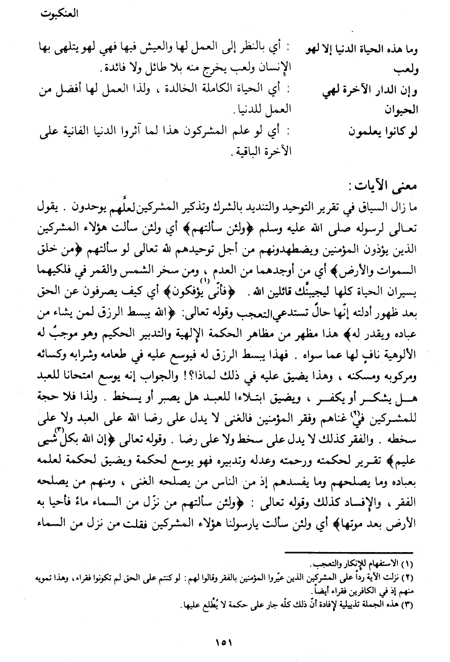 ما زال السياق في تقرير التوحيد والتنديد بالشرك وتذكير المشركين لعلّهم يوحدون. يقول تعالى لرسوله صَلَّى اللهُ عَلَيْهِ وَسَلَّمَ {وَلَئِنْ سَأَلْتَهُمْ} أي لئن سألت هؤلاء المشركين الذين يؤذون المؤمنين ويضطهدونهم من أجل توحيدهم لله تعالى لو سألتهم {مَنْ خَلَقَ السَّمَاوَاتِ وَالْأَرْضَ} أي من أوجدهما من العدم، ومن سخر الشمس والقمر في فلكيهما يسيران الحياة كلها ليجيبُنَّك قائلين الله. {فَأَنَّى (1) يُؤْفَكُونَ} أي كيف يصرفون عن الحق بعد ظهور أدلته إنها حال تستدعي التعجب وقوله تعالى: {اللهُ يَبْسُطُ الرِّزْقَ لِمَنْ يَشَاءُ مِنْ عِبَادِهِ وَيَقْدِرُ لَهُ} هذا مظهر من مظاهر الحكمة الإلهية والتدبير الحكيم وهو موجب له الألوهية نافٍ لها عما سواه. فهذا يبسط الرزق له فيوسّع عليه في طعامه وشرابه وكسائه ومركوبه ومسكنه، وهذا يضيق عليه في ذلك لماذا؟! والجواب: إنه يوسع امتحانا للعبد هل يشكر أو يكفر، ويضيق ابتلاءًا للعبد هل يصبر أو يسخط. ولذا فلا حجة للمشركين في (2) غناهم وفقر المؤمنين فالغنى لا يدل على رضا الله على العبد ولا على سخطه. والفقر كذلك لا يدل على سخط ولا على رضا. وقوله تعالى {إِنَّ اللهَ بِكُلِّ (3) شَيْءٍ عَلِيمٌ} تقرير لحكمته ورحمته وعدله وتدبيره فهو يوسع لحكمة ويضيق لحكمة لعلمه بعباده وما يصلحهم وما يفسدهم إذ من الناس من يصلحه الغنى، ومنهم من يصلحه الفقر، والإفساد كذلك وقوله تعالى: {وَلَئِنْ سَأَلْتَهُمْ مَنْ نَزَّلَ مِنَ السَّمَاءِ مَاءً فَأَحْيَا بِهِ الْأَرْضَ مِنْ بَعْدِ مَوْتِهَا} أي ولئن سألت يا رسولنا هؤلاء المشركين فقلت من نزل من السماء