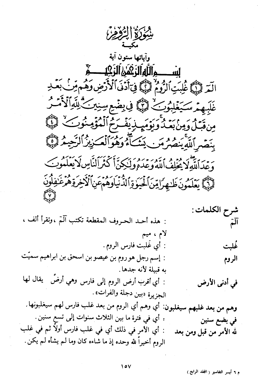 الم (1) غُلِبَتِ الرُّومُ (2) فِي أَدْنَى الْأَرْضِ وَهُمْ مِنْ بَعْدِ غَلَبِهِمْ سَيَغْلِبُونَ (3) فِي بِضْعِ سِنِينَ لِلَّهِ الْأَمْرُ مِنْ قَبْلُ وَمِنْ بَعْدُ وَيَوْمَئِذٍ يَفْرَحُ الْمُؤْمِنُونَ (4) بِنَصْرِ اللهِ يَنْصُرُ مَنْ يَشَاءُ وَهُوَ الْعَزِيزُ الرَّحِيمُ (5) وَعْدَ اللهِ لا يُخْلِفُ اللهُ وَعْدَهُ وَلَكِنَّ أَكْثَرَ النَّاسِ لا يَعْلَمُونَ (6) يَعْلَمُونَ ظَاهِراً مِنَ الْحَيَاةِ الدُّنْيَا وَهُمْ عَنِ الْآخِرَةِ هُمْ غَافِلُونَ (7)