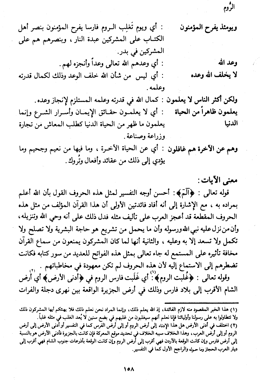 وقوله تعالى: {غُلِبَتِ الرُّومُ} (1) : أي غَلَبت فارس الروم في {فِي أَدْنَى الْأَرْضِ} أي (2) أرض الشام الأقرب إلى بلاد فارس وذلك في أرض الجزيرة الواقعة بين نهري دجلة والفرات