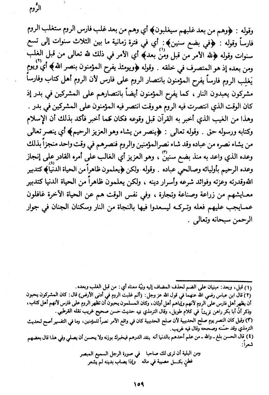 وقوله: {وَهُمْ مِنْ بَعْدِ غَلَبِهِمْ سَيَغْلِبُونَ} أي وهم من بعد غلب فارس الروم ستغلب الروم فارسا وقوله: {فِي بِضْعِ سِنِينَ} أي في فترة زمانية ما بين الثلاث سنوات إلى تسع سنوات وقوله {لِلَّهِ الْأَمْرُ مِنْ قَبْلُ وَمِنْ (1) بَعْدُ} أي الأمر في ذلك لله تعالى من قبل الغلب ومن بعده إذ هو المتصرف في خلقه. وقوله {وَيَوْمَئِذٍ يَفْرَحُ الْمُؤْمِنُونَ بِنَصْرِ اللهِ} أي (2) يوم يغلب الروم فارساً يفرح المؤمنون بانتصار الروم على فارس لأن الروم أهل كتاب وفارساً مشركون يعبدون النار، كما يفرح المؤمنون أيضاً بانتصارهم على المشركين في بدر إذ كان الوقت الذي انتصرت فيه الروم هو وقت انتصر فيه المؤمنون على المشركين في بدر. وهذا من الغيب الذي أخبر به القرآن قبل وقوعه فكان كما أخبر فأكد بذلك أن الإسلام وكتابه ورسوله حق. وقوله تعالى: {يَنْصُرُ مَنْ يَشَاءُ وَهُوَ الْعَزِيزُ الرَّحِيمُ} أي ينصر تعالى من يشاء نصره من عباده وقد شاء نصر المؤمنين والروم فنصرهم في وقت واحد منجزاً بذلك وعده الذي واعد به منذ بضع سنين (3) ، وهو العزيز أي الغالب على أمره القادر على إنجاز وعده الرحيم بأوليائه وصالحي عباده. وقوله ولكن {يَعْلَمُونَ ظَاهِراً مِنَ الْحَيَاةِ الدُّنْيَا (4) } كتدبير الله وقدرته وعزته وفوائد شرعه وأسرار دينه. ولكن يعلمون ظاهراً من الحياة الدنيا كتدبير معايشهم من زراعة وصناعة وتجارة، وفي نفس الوقت هم عن الحياة الآخرة غافلون عما يجب عليهم فعله وتركه ليسعدوا فيها بالنجاة من النار وسكنان الجنان في جوار الرحمن سبحانه وتعالى.