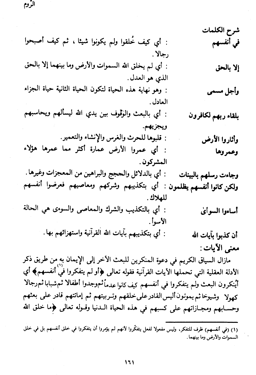 ما زال السياق الكريم في دعوة المنكرين للبعث الآخر إلى الإيمان به من طريق ذكر الأدلة العقلية التي تحملها الآيات القرآنية فقوله تعالى {أَوَلَمْ يَتَفَكَّرُوا فِي أَنْفُسِهِمْ (1) } أي أينكرون البعث ولم يتفكروا في أنفسهم كيف كانوا عدماً ثم وجدوا أطفالاً ثم شبابا ثم رجالاً كهولاً وشيوخاً ثم يموتون أليس القادر على خلقهم وتربيتهم ثم إماتتهم قادر على بعثهم وحسابهم ومجازاتهم على كسبهم في هذه الحياة الدنيا وقوله تعالى {مَا خَلَقَ اللهُ