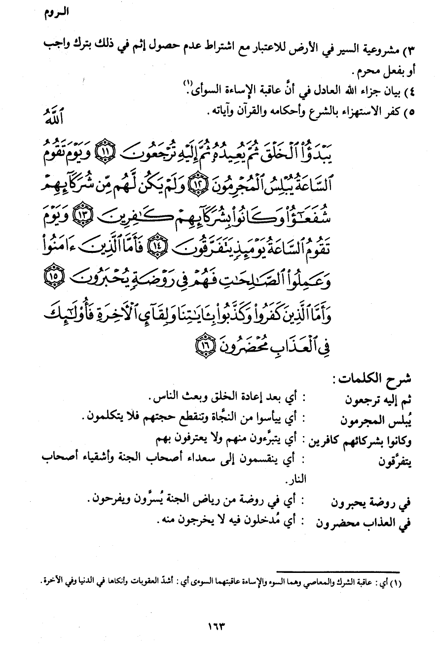 اللهُ يَبْدأُ الْخَلْقَ ثُمَّ يُعِيدُهُ ثُمَّ إِلَيْهِ تُرْجَعُونَ (11) وَيَوْمَ تَقُومُ السَّاعَةُ يُبْلِسُ الْمُجْرِمُونَ (12) وَلَمْ يَكُنْ لَهُمْ مِنْ شُرَكَائِهِمْ شُفَعَاءُ وَكَانُوا بِشُرَكَائِهِمْ كَافِرِينَ (13) وَيَوْمَ تَقُومُ السَّاعَةُ يَوْمَئِذٍ يَتَفَرَّقُونَ (14) فَأَمَّا الَّذِينَ آمَنُوا وَعَمِلُوا الصَّالِحَاتِ فَهُمْ فِي رَوْضَةٍ يُحْبَرُونَ (15) وَأَمَّا الَّذِينَ كَفَرُوا وَكَذَّبُوا بِآياتِنَا وَلِقَاءِ الْآخِرَةِ فَأُولَئِكَ فِي الْعَذَابِ مُحْضَرُونَ (16)