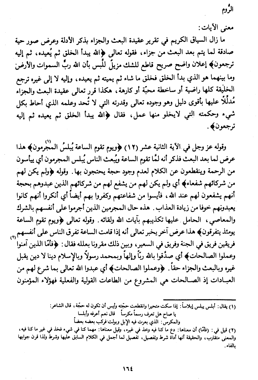 وقوله عز وجل في الآية الثانية عشر (12) {وَيَوْمَ تَقُومُ السَّاعَةُ يُبْلِسُ (1) الْمُجْرِمُونَ} هذا عرض لما بعد البعث فذكر أنه لماّ تقوم الساعة ويبعث الناس يبلس المجرمون أي ييأسون من الرحمة وينقطعون عن الكلام لعدم وجود حجة يحتجون بها. وقوله {وَلَمْ يَكُنْ لَهُمْ مِنْ شُرَكَائِهِمْ شُفَعَاءُ} أي ولم يكن لهم من يشفع لهم من شركائهم الذين عبدوهم بحجة أنهم يشفعون لهم عند الله، فأيسوا من شفاعتهم وكفروا بهم أيضا أي أنكروا أنهم كانوا يعبدونهم خوفاً من زيادة العذاب. هذه حال المجرمين الذين أجرموا على أنفسهم بالشرك والمعاصي، الحامل عليها تكذيبهم بآيات الله ولقائه. وقوله تعالى {وَيَوْمَ تَقُومُ السَّاعَةُ يَوْمَئِذٍ يَتَفَرَّقُونَ} هذا عرض آخر يخبر تعالى أنه إذا قامت الساعة تفرق الناس على أنفسهم فريقين فريق في الجنة وفريق في السعير، وبين ذلك مقرونا بعلله فقال: {فَأَمَّا الَّذِينَ آمَنُوا (2) وَعَمِلُوا الصَّالِحَاتِ} أي صدّقوا بالله ربّاً وإلهاً وبمحمد رسولاً وبالإسلام ديناً لا دين يقبل غيره وبالبعث والجزاء حقا. {وَعَمِلُوا الصَّالِحَاتِ} أي عبدوا الله تعالى بما شرع لهم من العبادات إذ الصالحات هي المشروع من الطاعات القولية والفعلية فهؤلاء المؤمنون