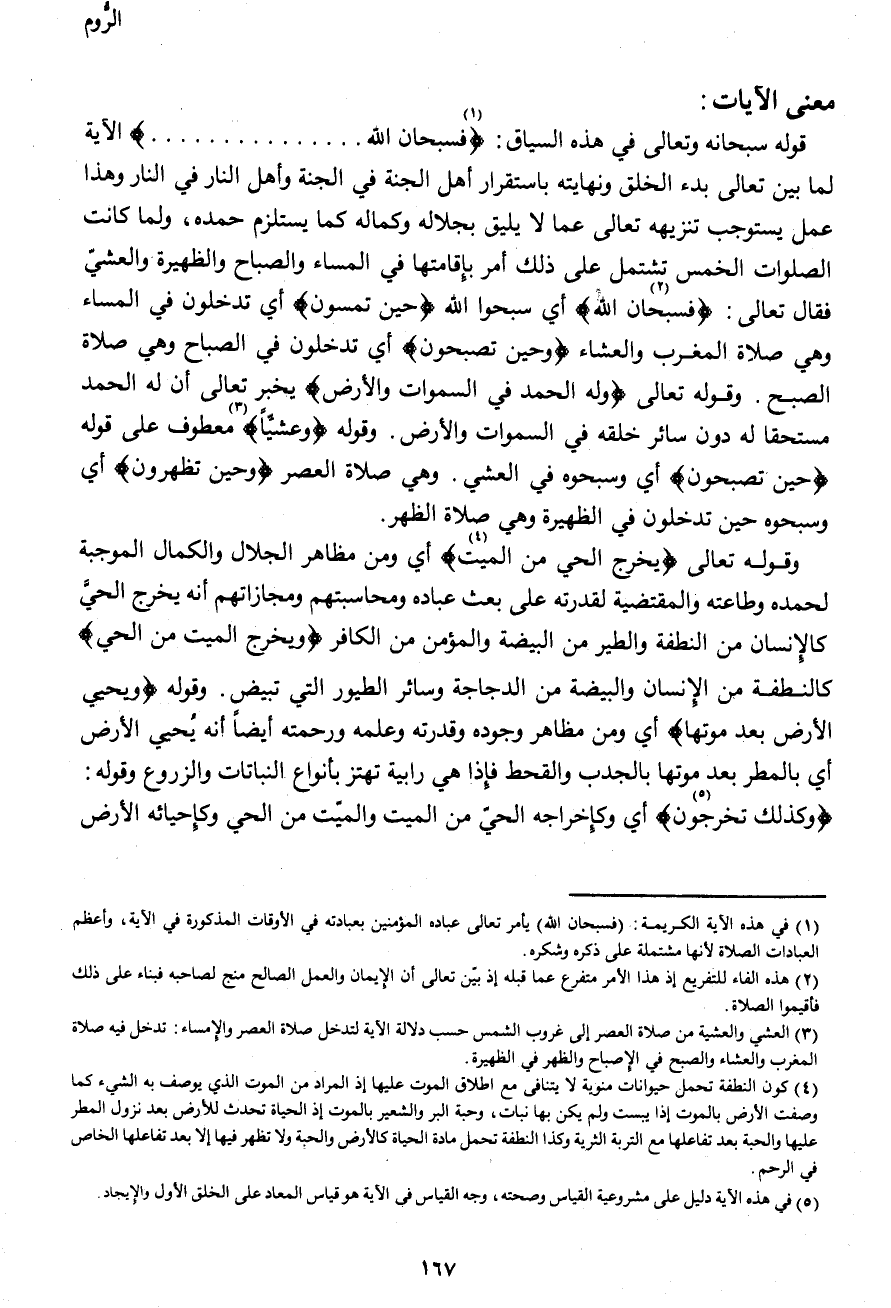 قوله سبحانه وتعالى في هذا السياق: {فَسُبْحَانَ (1) اللهِ..........} الآية. لما بين تعالى بدء الخلق ونهايته باستقرار أهل الجنة في الجنة وأهل النار في النار وهذا عمل يستوجب تنزيهه تعالى عما لا يليق بجلاله وكماله كما يستلزم حمده، ولما كانت الصلوات الخمس تشتمل على ذلك أمر بإقامتها في المساء والصباح والظهيرة والعشيّ فقال تعالى: {فَسُبْحَانَ (2) اللهِ} أي سبحوا الله {حِينَ تُمْسُونَ} أي تدخلون في المساء وهي صلاة المغرب والعشاء {وَحِينَ تُصْبِحُونَ} أي تدخلون في الصباح وهي صلاة الصبح. وقوله تعالى {وَلَهُ الْحَمْدُ فِي السَّمَاوَاتِ وَالْأَرْضِ} يخبر تعالى أن له الحمد مستحقا لها دون سائر خلقه في السموات والأرض. وقوله {وَعَشِيّاًً (3) } معطوف على قوله {حِينَ تُصْبِحُونَ} أي وسبحوه في العشي. وهي صلاة العصر {وَحِينَ تُظْهِرُونَ} أي وسبحوه حين تدخلون في الظهيرة وهي صلاة الظهر.