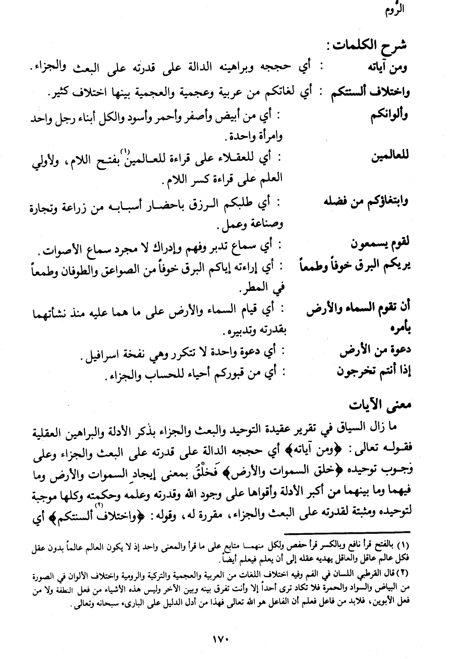 2 - قال القرطبي اللسان في الفم وفيه اختلاف اللغات من العربية والعجمية والتركية والرومية واختلاف الألوان في الصورة من البياض والسواد والحمرة فلا تكاد ترى أحداً إلا وأنت تفرق بينه وبين الآخر وليس هذه الأشياء من فعل النطفة ولا من فعل الأبوين، فلا بد من فاعل فعلم أن الفاعل هو الله تعالى فهذا من أدل دليل على البارئ سبحانه وتعالى.