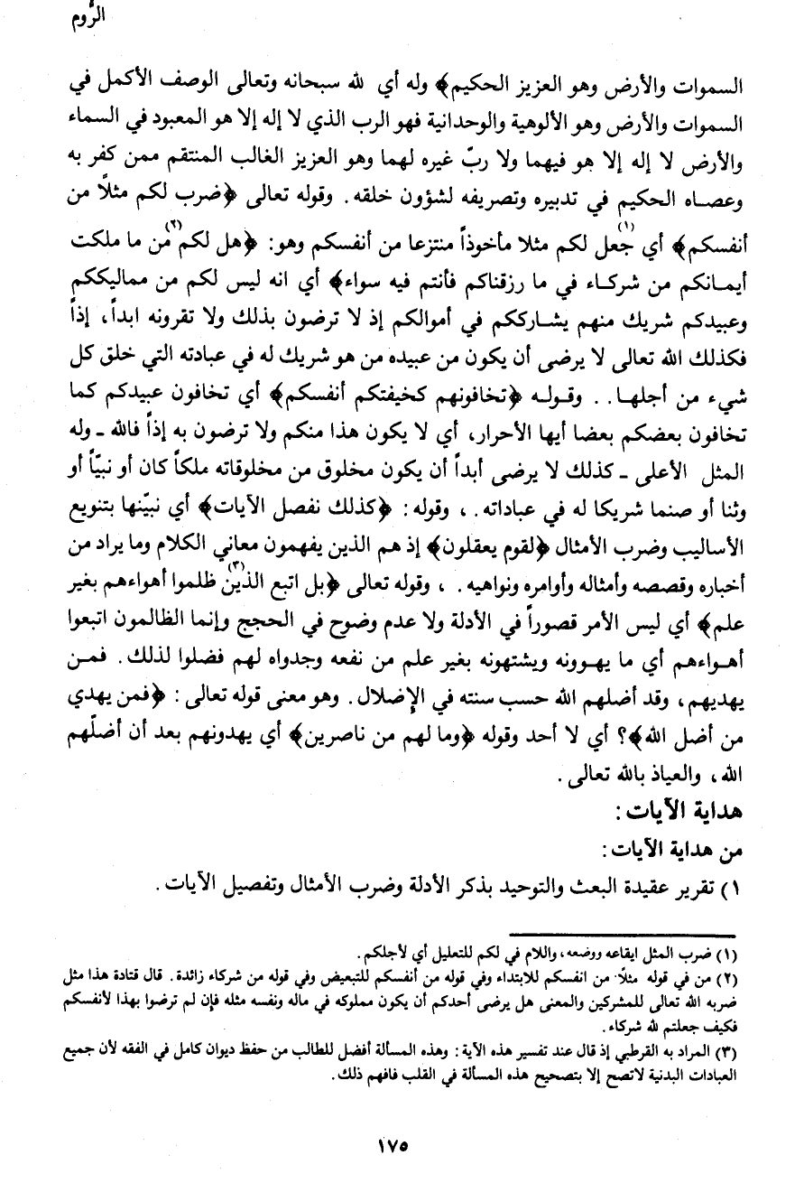 السَّمَاوَاتِ وَالْأَرْضِ وَهُوَ الْعَزِيزُ الْحَكِيمُ} وله أي لله سبحانه وتعالى الوصف الأكمل في السموات والأرض وهو الألوهية والوحدانية فهو الرب الذي لا إله إلا هو المعبود في السماء والأرض لا إله إلا هو فيهما ولا رب غيره لهما وهو العزيز الغالب المنتقم ممن كفر به وعصاه الحكيم في تدبيره وتصريفه لشؤون خلقه. وقوله تعالى {ضَرَبَ لَكُمْ مَثَلاً (1) مِنْ أَنْفُسِكُمْ} أي جعل لكم مثلا مأخوذا منتزعاً من أنفسكم (2) وهو: {هَلْ لَكُمْ مِنْ مَا مَلَكَتْ أَيْمَانُكُمْ مِنْ شُرَكَاءَ فِي مَا رَزَقْنَاكُمْ فَأَنْتُمْ فِيهِ سَوَاءٌ} أي أنه ليس لكم من مماليككم وعبيدكم شريك منهم يشارككم في أموالكم إذ لا ترضون بذلك ولا تقرونه أبداً، إذاً فكذلك الله تعالى لا يرضى أن يكون من عبيده من هو شريك له في عبادته التي خلق كل شيء من أجلها.. وقوله {تَخَافُونَهُمْ كَخِيفَتِكُمْ أَنْفُسَكُمْ} أي تخافون عبيدكم كما تخافون بعضكم بعضا أيها الأحرار، أي لا يكون هذا منكم ولا ترضون به إذاً فالله – وله المثل الأعلى- كذلك لا يرضى أبداً أن يكون مخلوق من مخلوقاته ملكا كان أو نبياً أو وثنا أو صنماً شريكا له في عباداته. وقوله: {كَذَلِكَ نُفَصِّلُ الْآياتِ} أي نبيّنها بتنويع الأساليب وضرب الأمثال {لِقَوْمٍ يَعْقِلُونَ} إذ هم الذين يفهمون معاني الكلام وما يراد من أخباره وقصصه وأمثاله وأوامره ونواهيه. وقوله تعالى {بَلِ اتَّبَعَ الَّذِينَ ظَلَمُوا أَهْوَاءَهُمْ بِغَيْرِ عِلْمٍ} أي ليس الأمر قصوراً في الأدلة ولا عدم وضوح في الحجج وإنما الظالمون اتبعوا أهواءهم أي ما يهوونه ويشتهونه بغير علمٍ من نفعه وجدواه لهم فضلوا لذلك. فمن يهديهم، وقد أضلهم الله حسب سنته في الإضلال. وهو معنى قوله تعالى: {فَمَنْ يَهْدِي مَنْ أَضَلَّ اللهُ} ؟ أي لا أحد وقوله {وَمَا لَهُمْ مِنْ نَاصِرِينَ} أي يهدونهم بعد أن أضلهم الله، والعياذ بالله تعالى.