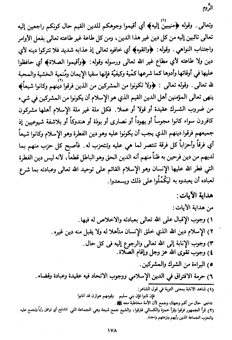 وتعالى. وقوله {مُنِيبِينَ (1) إِلَيْهِ} أي أقيموا وجوهكم للدين القيم حال كونكم راجعين إليه تعالى تائبين إليه من كل دين غير هذا الدين، ومن كل طاعة غير طاعته تعالى بفعل الأوامر واجتناب النواهي. وقوله: {وَاتَّقُوهُ} أي خافوه تعالى إذ عذابه شديد فلا تتركوا دينه لأي دين ولا طاعته لأي مطاع غير الله تعالى ورسوله وقوله: {وَأَقِيمُوا الصَّلاةَ} أي حافظوا عليها في أوقاتها وأدوها كما شرعها كمّية وكيفيّة فإنها سقيا الإيمان ومُنمية الخشية والمحبة لله تعالى. وقوله تعالى: {وَلا تَكُونُوا مِنَ الْمُشْرِكِينَ مِنَ الَّذِينَ فَرَّقُوا (2) دِينَهُمْ وَكَانُوا شِيَعاً} ينهى تعالى المؤمنين من أهل الدين القيم الذي هو الإسلام أن يكونوا من المشركين في شيء من ضروب الشرك عقيدة وقولا وعملا. فكل ملة غير ملة الإسلام أهلها مشركون كافرون سواء كانوا مجوسا أو يهوداً أو نصارى أو بوذة أو هندوكاً أو بلاشفة شيوعيين إذ جميعهم فرقوا دينهم الذي يجب أن يكونوا عليه وهو دين الفطرة وهو الإسلام وكانوا شيعا أي فرقا وأحزاباً كل فرقة تنتصر لما هي عليه وتنحزب له. فأصبح كل حزب منهم بما لديهم من دين فرحين به ظنا منهم أنه الدين الحق وهو الباطل قطعا، لأنه ليس دين الفطرة التي فطر الله عليها الإنسان وهو الإسلام القائم على توحيد الله تعالى وعبادته بما شرع لعباده أن يعبدوه به ليكملوا على ذلك ويسعدوا.